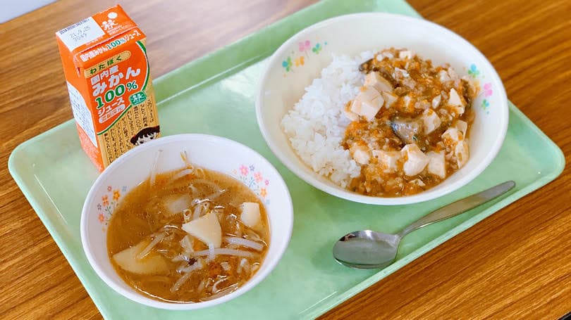 エブリワン・ヴィーガン給食としての実施は3回目となるこの日のメニューは、マーボー茄子、もやしの中華スープ、ごはん。牛乳の代わりにみかんジュースがつきます。マーボー茄子には、人参やピーマン、豆腐などが含まれ、ひき肉の代わりに大豆ミートが使われていました。