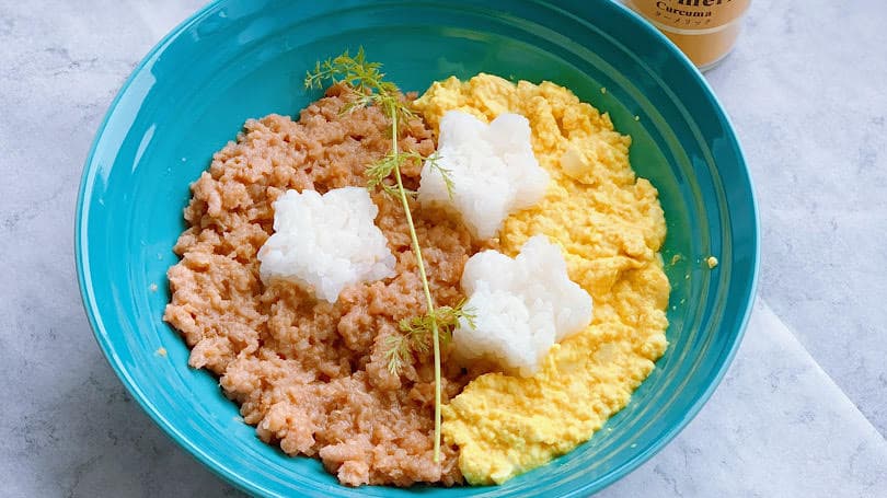 大豆ミートで作るそぼろは、大豆ミートを生ミンチタイプのものを使用することで、よりそぼろ風に近づきます。たまご風は、ターメリックで色付けを。甘いたまご風にしたい場合は、甜菜糖をプラスして!