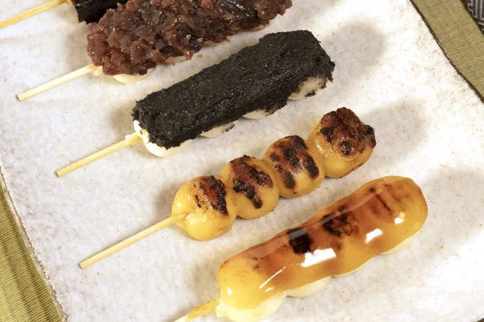よ兵衛の商品といえば1日最高販売数2,400本を記録した自慢の焼き団子。創業以来、国産の原料にこだわり「普段のお団子より1段うえ」を目指し、生醬油、海苔、みたらし団子を毎日職人が手で焼いている。つぶあんと胡麻あんのお団子はあえて焼かないことでモチモチとした食感が根強いファンを増やしている。