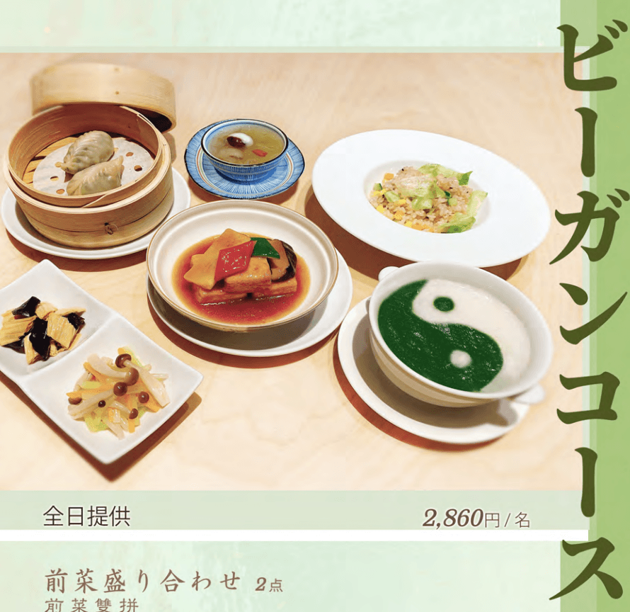 野菜のみで構成された『ヴィーガン』ディナーコース(12,000円)は、メニューをみていただけるとわかると思いますが、自宅で再現するのは難しい広東料理を堪能できること間違いなし。ヴィーガンではないけど、ヘルシーなメニューを選択したい!美容・アンチエイジングに関心が高い方からも人気のようです。