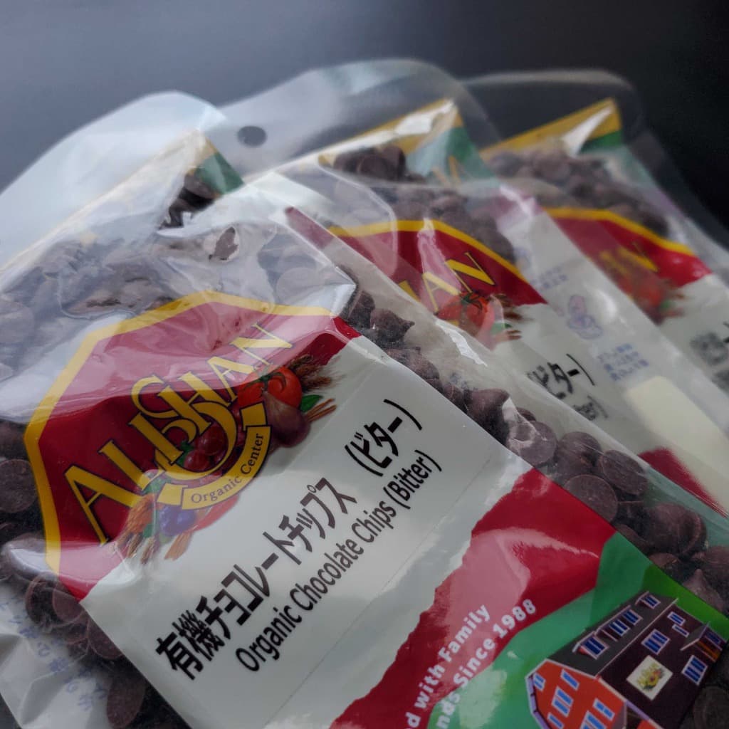 今回はアリサン 有機チョコレートチップス(ビター)を使いました。有機原料のみ、カカオ70%のチョコでとても使い勝手が良かったです。余談ですが、アリサンの商品の原料に記載されていた「有機砂糖」について問い合わせをしたところ「キビ砂糖」を使用しているとの回答を頂きました。