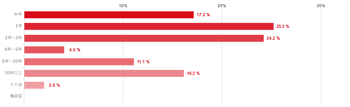 ヴィーガン歴1年が25.3%と最も多く、続いて2~3年で24.2%、半年17.2%と続きます。