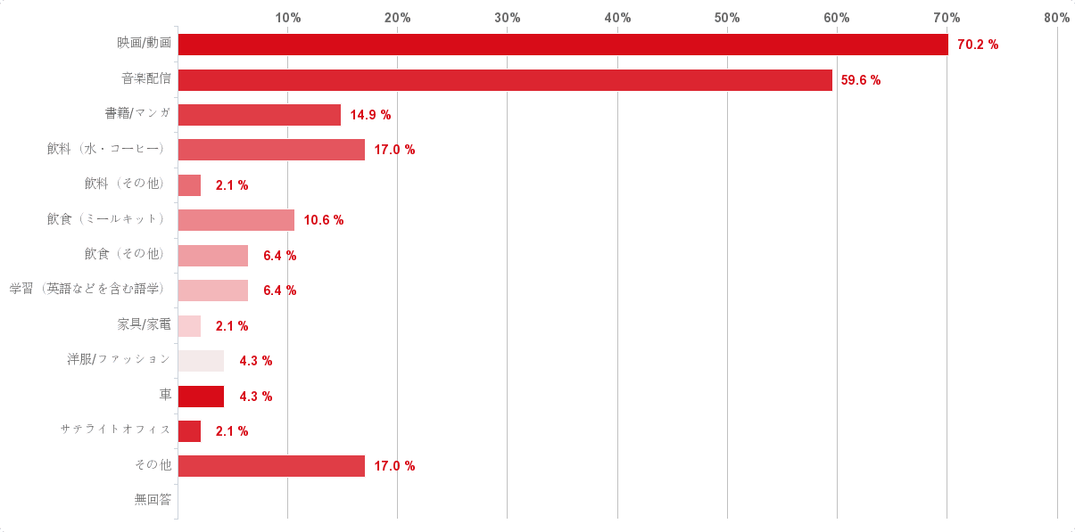 利用したことのあるサブスクリプションで、最も多かったのが「映画/動画」で70.2%、続いて「音楽配信」59.6%であった。その他と回答いただいた方の中には「お花」「サプリメント」「洗剤」「新聞」の利用があった。