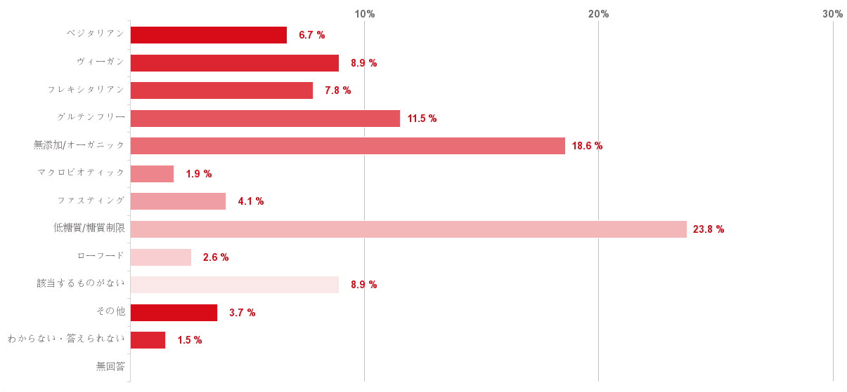 自身が取り組んでいる食生活について訪ねたところ、低糖質・糖質制限が全体の23.8%となりました。続いて、無添加・オーガニック18.6%、グルテンフリー11.5%、ヴィーガン8.9%また、週に1回以上、意識的に動物性食品を減らす食生活を送るフレキシタリアンは全体の7.8%、ベジタリアン6.7%となりました。