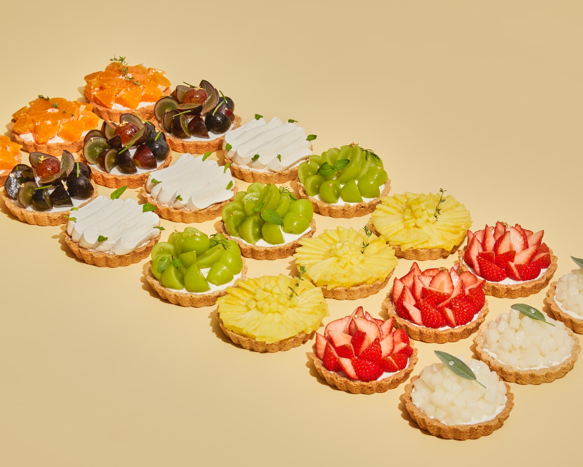 サクサクとした食感に、コクのある甘みが特徴のタルト生地は、米粉やアーモンドを用いて仕上げ、タルトに敷きつめた豆乳ベースの自家製クリームの上に、毎朝市場で厳選したフルーツをたっぷりと載せたお一人様用サイズのミニホールタルト(10cm) 。軽い口当たりのタルトと豆乳クリームの組み合わせは、旬のフルーツの美味しさを最大限に引き立ててくれます。