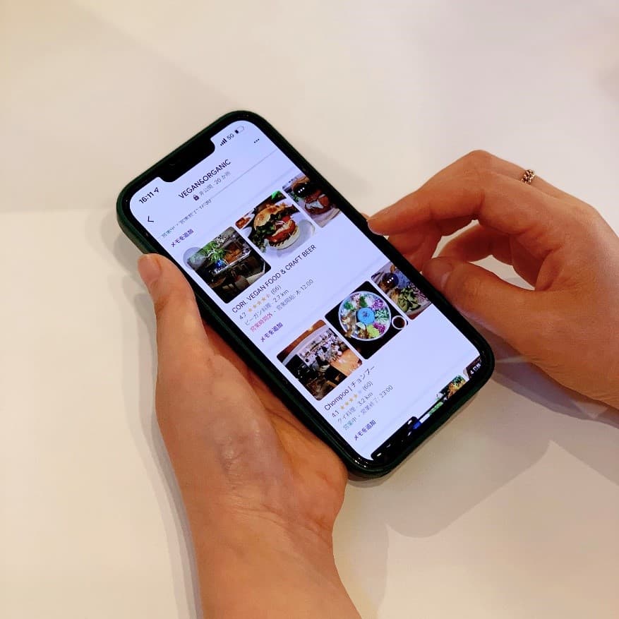 食に感度が高い方で、自分にとって何が心地いい食事なのか、「ヴィーガン」というジャンルだけに囚われた店選びをしない方の声を参考にすることがほとんどなので、ほぼグルメサイトは見ないですね。お店を探す時は、クチコミや雑誌をみたり街歩きをして見つけることがほとんどです。その後にInstagramでお店の表情をチェックし、どんな人がお店を運営していて、どんな人が集まっているのか?メニュー内容以上にも大切だと思う基準を自分の中で決めています。そういった形で収集したお店の情報は、携帯のメモ帳やMYマップ機能で管理しています。