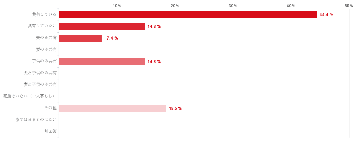 食事の共有について「共有している」を選択した方が44.4%、「共有していない」「子供のみ共有」を選択した方がそれぞれ14.8%となった。