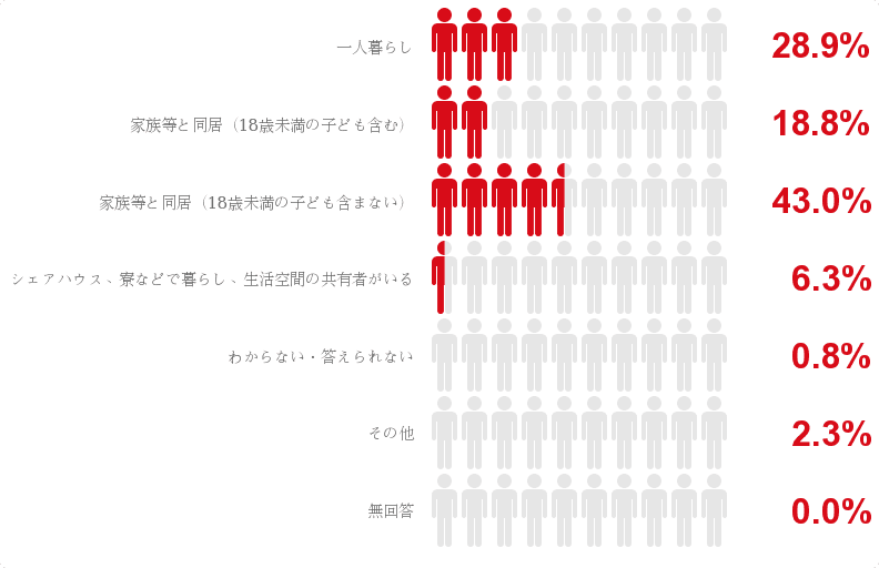 回答者の現在の暮らしについてですが、「家族等と同居(18歳未満の子供を含まない)」を選択した方が、43.0%、「一人暮らし」28.9%、「家族等と同居(18歳未満の子供含む)」18.8%でした。