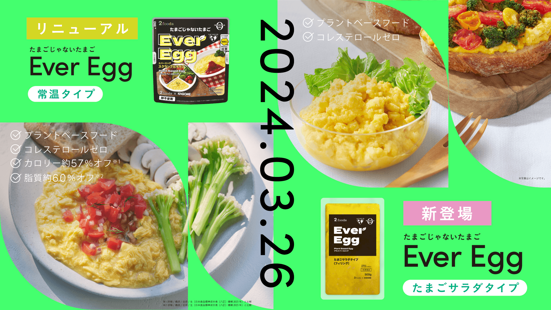 植物由来食品を展開する「2foods(トゥーフーズ)」とカゴメ株式会社は、共同開発商品のプラントベースエッグ「Ever Egg(エバーエッグ)」常温タイプ※3 ※4 を2024年3月26日(火) より2foods公式オンラインショップ・店舗にてリニューアル発売※5 。