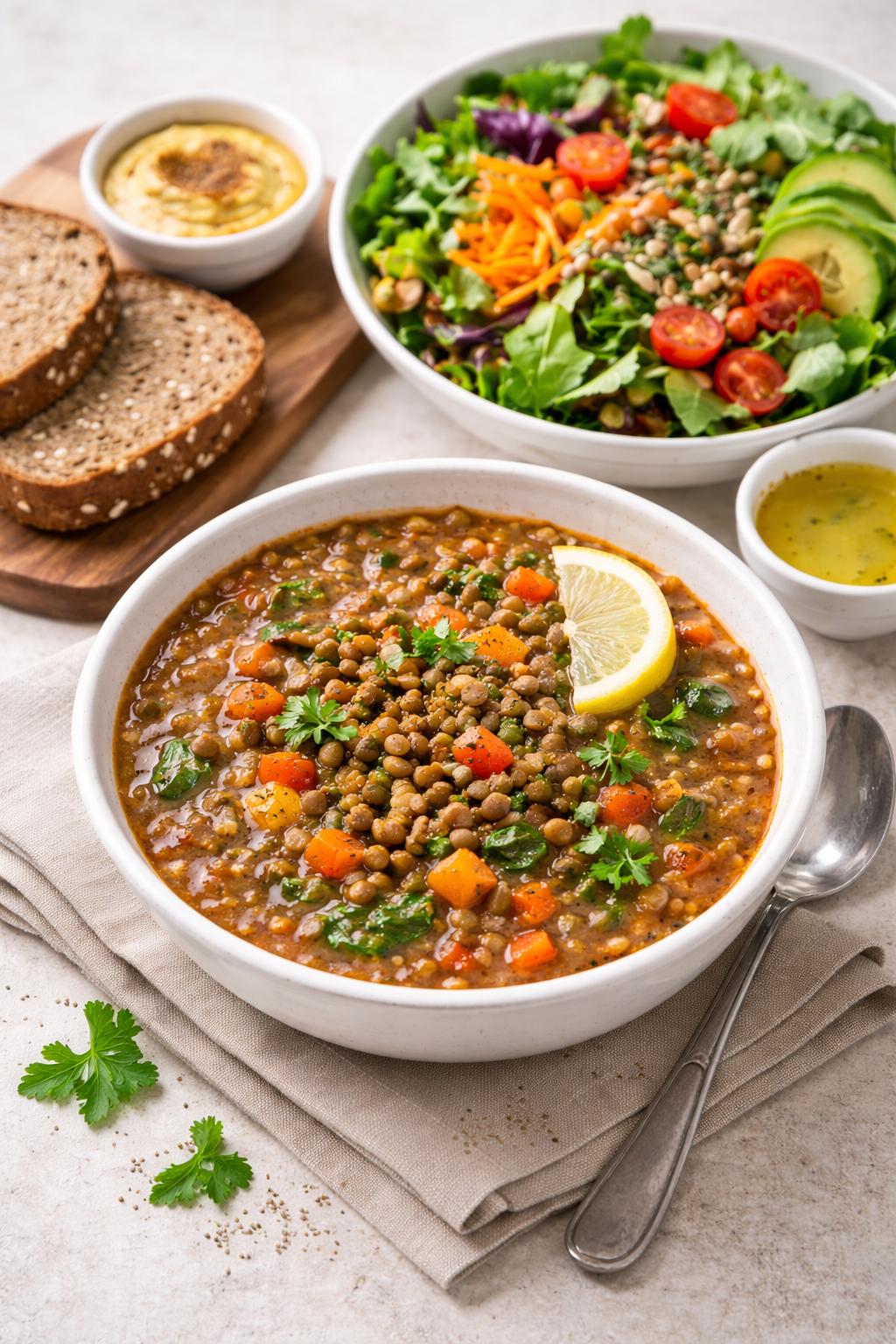・レンズ豆のスープ+全粒パン+野菜たっぷりサラダ