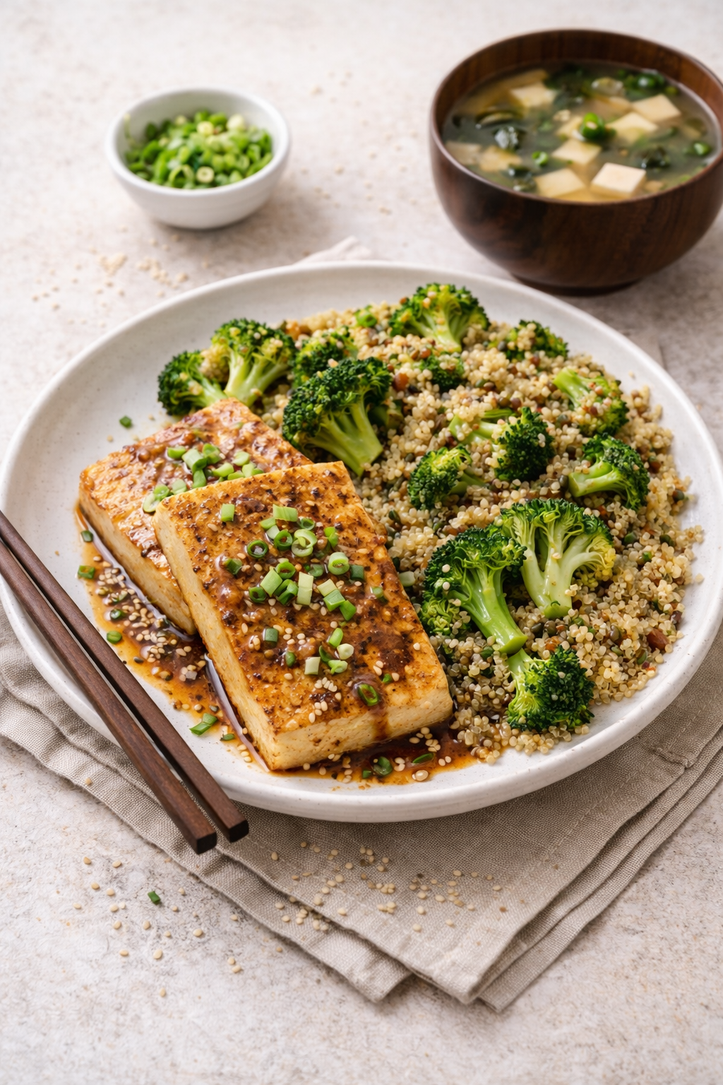 ・豆腐ステーキ+キヌアとブロッコリーの炒め物+味噌汁