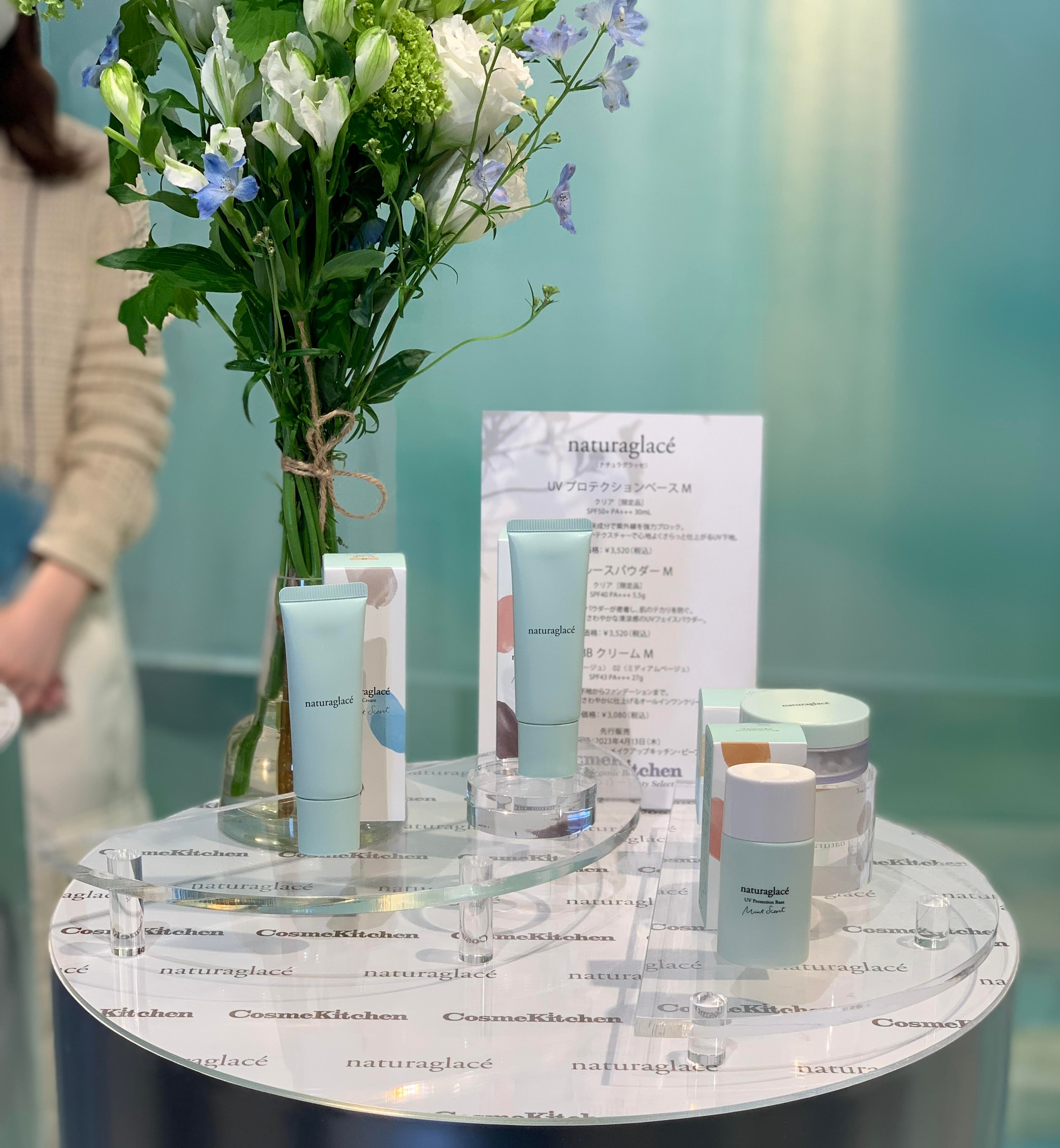 naturaglace(ナチュラグラッセ)は、100%天然成分にこだわり、「植物の力で日々を健やかに彩る」というコンセプトのもとベースメイク・メイクアップアイテムを展開。今回お披露目になった新製品は、昨年発売し即日完売となったナチュラル成分でひんやり感を実現するUVケアシリーズ。日焼け止め下地、BBクリーム、フェイスパウダーの3つ。今年初登場の紫外線対策もベースメイクも同時にできる「BBクリーム」は、梅雨時期や夏の暑いシーズンに活躍すること間違いなし。
