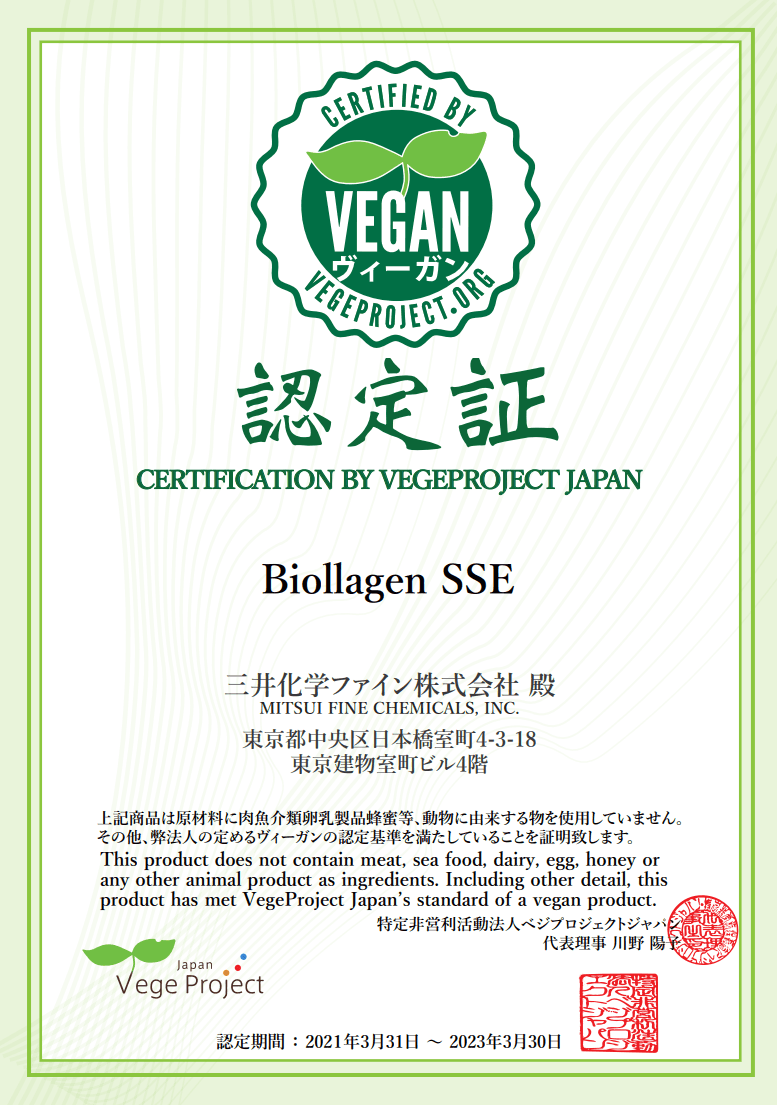 私たちが知見のある化粧品原料の申請承認フローとベジプロジェクトジャパン様のヴィーガンに対する知見を合わせることによって、化粧品で使用できる原料において日本で初めてヴィーガン認証を取得させていただきました。
