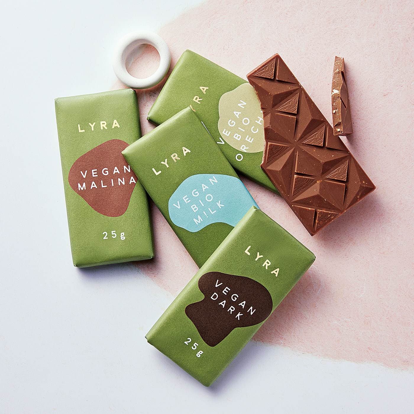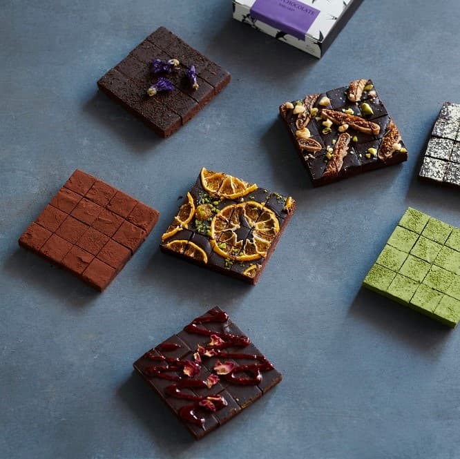 ダーク、ココナツミルク、ラズベリー、ナッツ、いずれもやさしくさっぱりして美味。フレーバーを食べ比べ、ヴィーガンチョコレートを楽しんで。