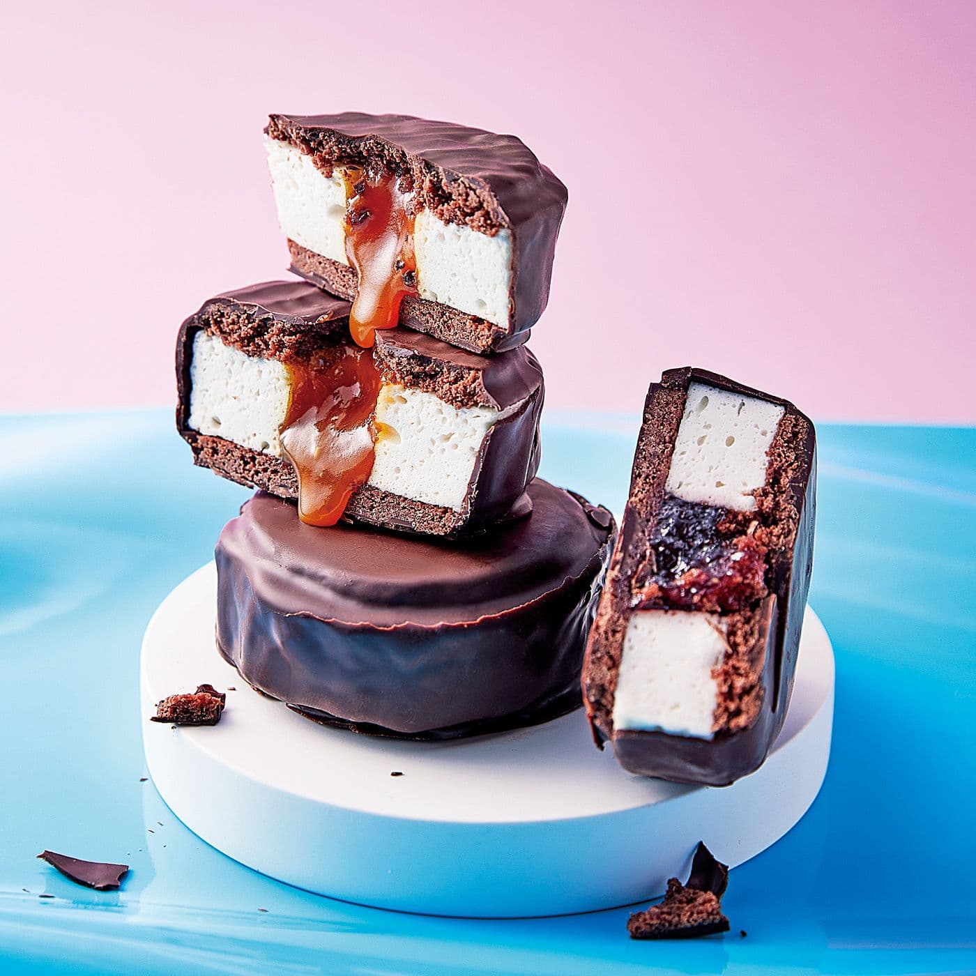 クラシック:ストロベリージャムとマシュマロをチョコビスケットでサンドし、ベルギーチョコレートでコーティング