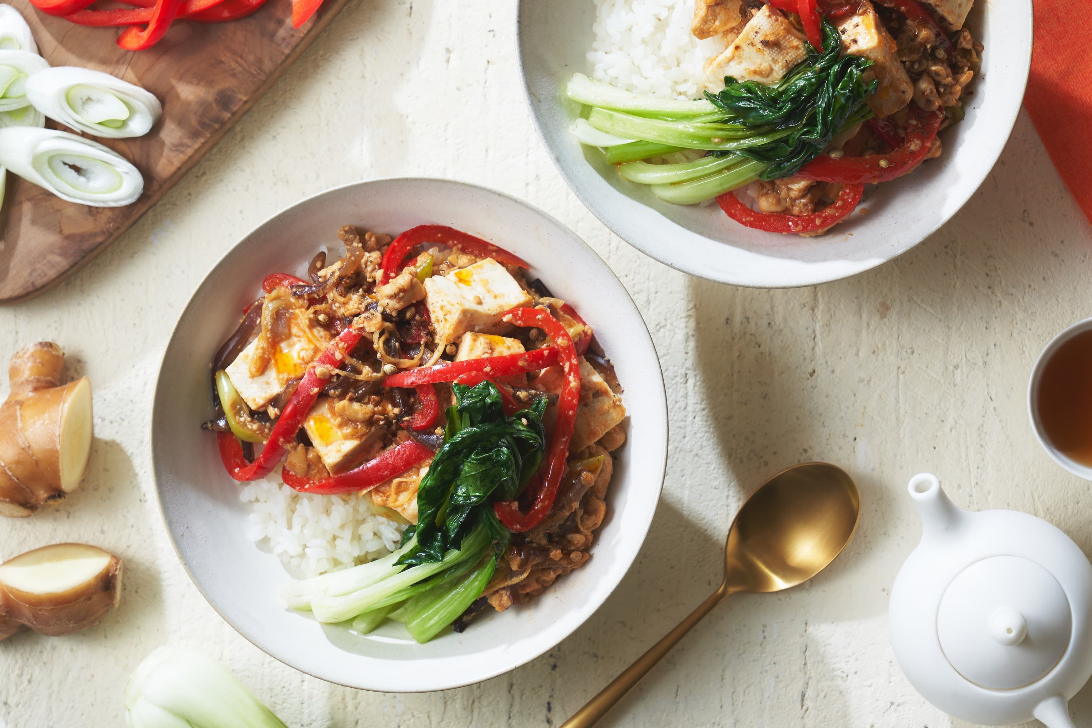 商品説明:炒めた長ねぎやしょうがが香るヴィーガン麻婆豆腐は、ナッツとスパイスが混ざったデュカを振ってアクセントに。スパイシーな香りに食欲そそられる仕上がり。