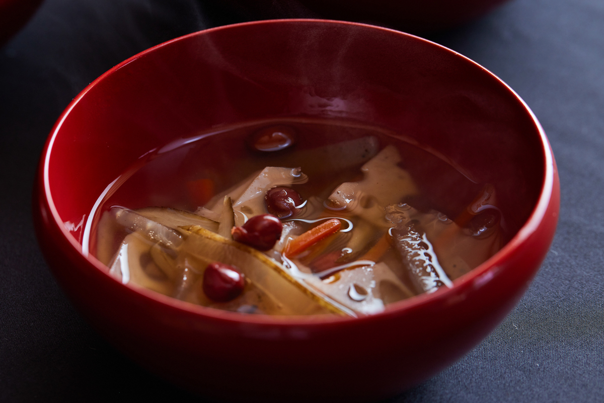 根来汁:智積院に長く伝わる精進料理の一椀。特徴はあずき入りという点。仏前に供えた食材を具材にしてきた歴史的な背景があります。