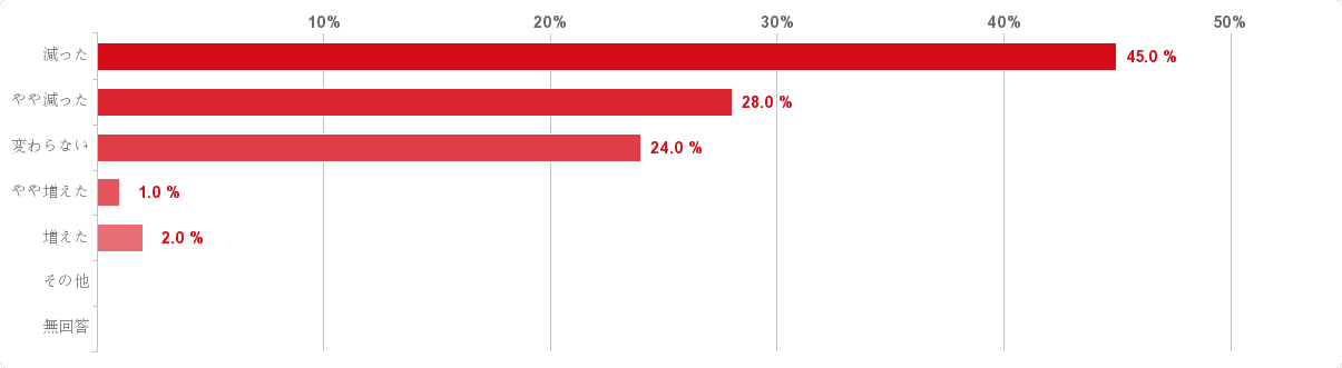 減ったを選択した方が45.0%と最も多く、やや減った28.0%、変わらない24.0%と続いた。
