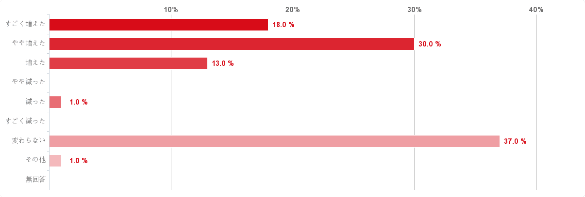 変わらないを選択した方が37.0%と最も多く、続いてやや増えた30.0%、すごく増えた18.0%、増えた13.0%と続いた。