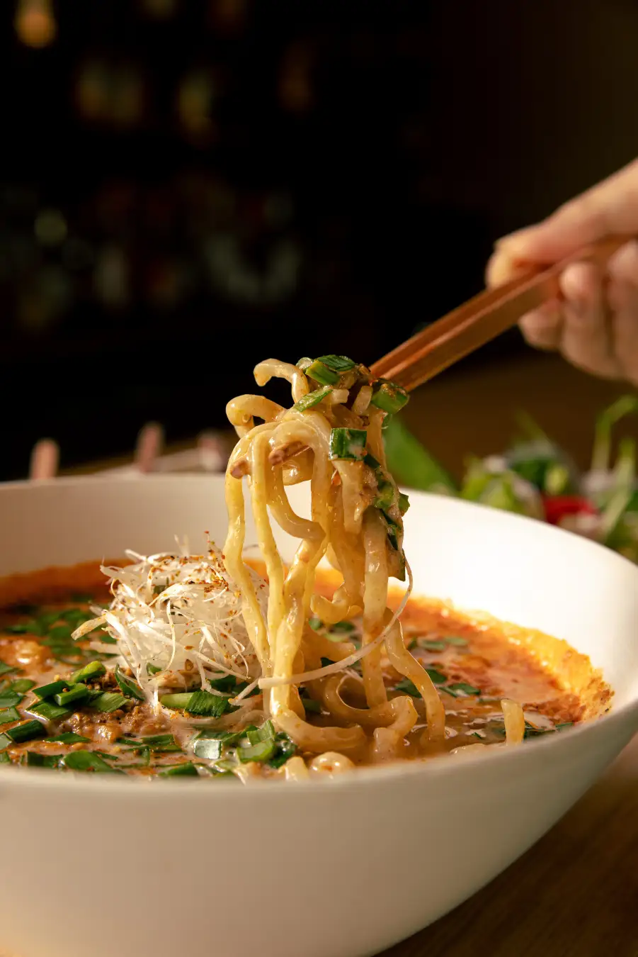 日光市産の豆乳と昆布を合わせたやさしいスープに、新鮮な野菜や生姜をはじめ、塩こうじを重ねた特製味噌や三種の厳選唐辛子を丁寧に加え、心地よい痺れと奥深い味わいに仕上げました。別添えの昆布だしで、味わいの変化もお楽しみいただけます。