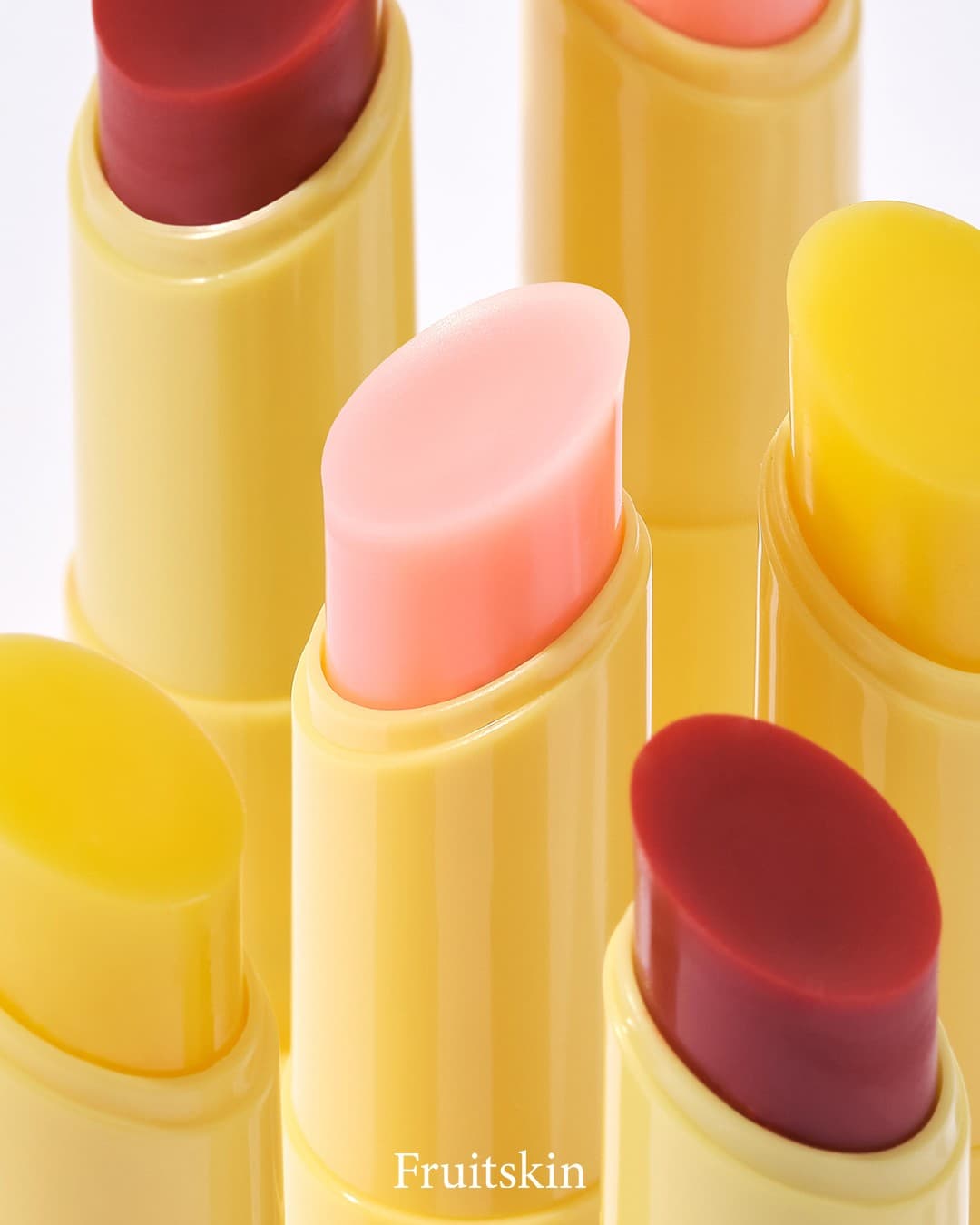 3つのカラーを取りそろえた、ヴィーガン認証取得済み「フルーツスキンビーガンリップバター」。