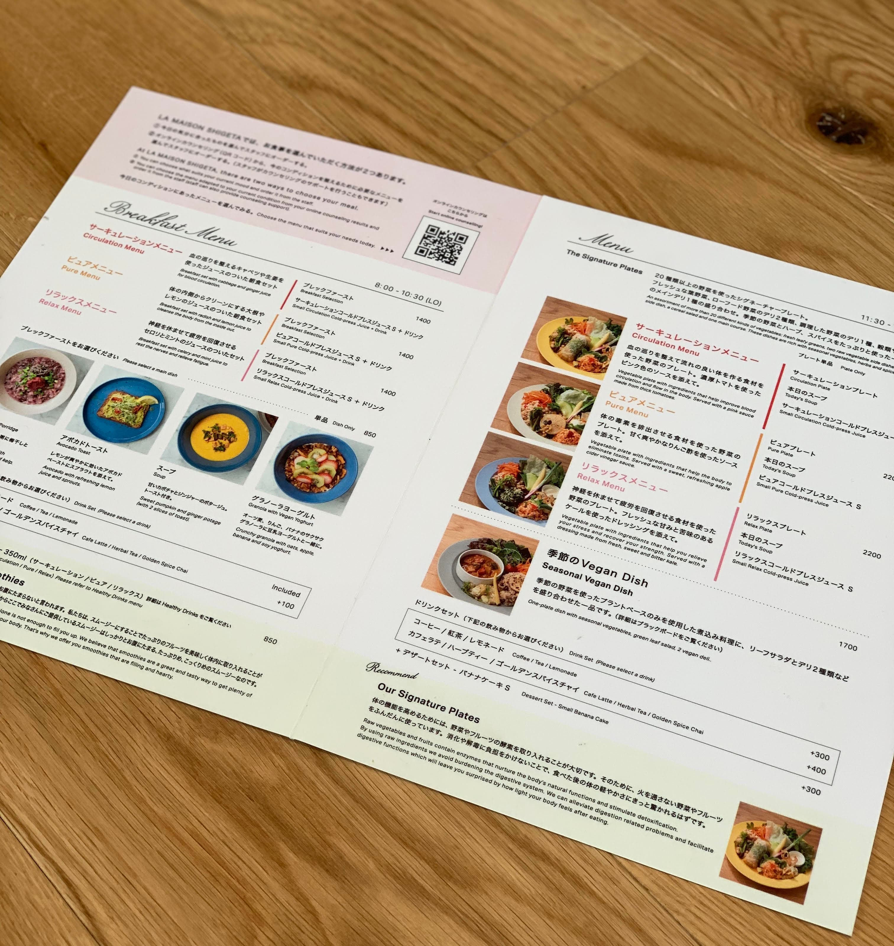 1階のダイニング・キッチンでは、メニュー表にあるQRコードをスマホで読み取ると、その日のコンディションに合わせたメニューを提案してくれます。新鮮なお野菜が約20種類以上入ったおすすめのワンプレートは、ゆっくりと時間をかけていただくことで、SHIGETAが提案するホリスティックビューティーを実感いただけると思います。