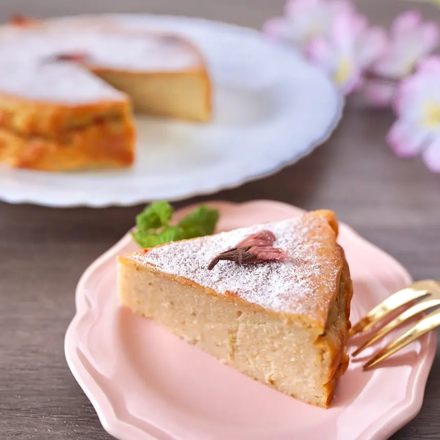 豆腐の水切りといった手間は不要で、混ぜて焼くだけで簡単に作れる、米粉のチーズケーキ。桜の葉がふわりと香り、春にぴったり。詳しいレシピはこちらから。