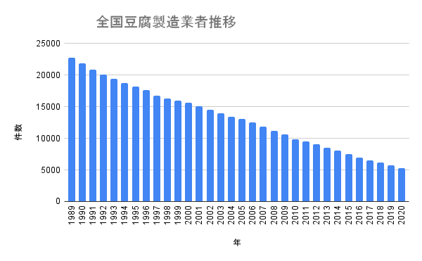 統計によれば、20年前には14,000店ほどあった豆腐屋さんは毎年400-500店ほど廃業し続け、今では全国で5,000店程度にまで減少。(1960年代には50,000店以上もありました…。)そこで実際に何件かの豆腐屋さんに話を伺ってみると、後継者問題、大手との競合、原価高と様々な要因がある中、私達の生活そのものの変化も豆腐屋さんの現実と乖離しているように感じられました。