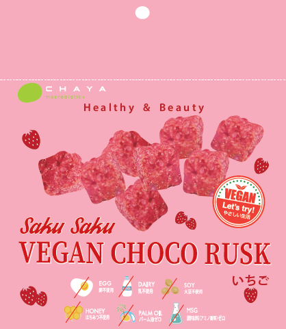 乳・卵・大豆・はちみつなどの動物性原料不使用、パーム油もアミノ酸(調味料)もゼロ。植物性100%、サクサク食感でコクのあるいちご味のチョコラスク。SAKUSAKUヴィーガンチョコラスクいちご ¥496 (税込)/Biople(CHAYAマクロビフーズ)
