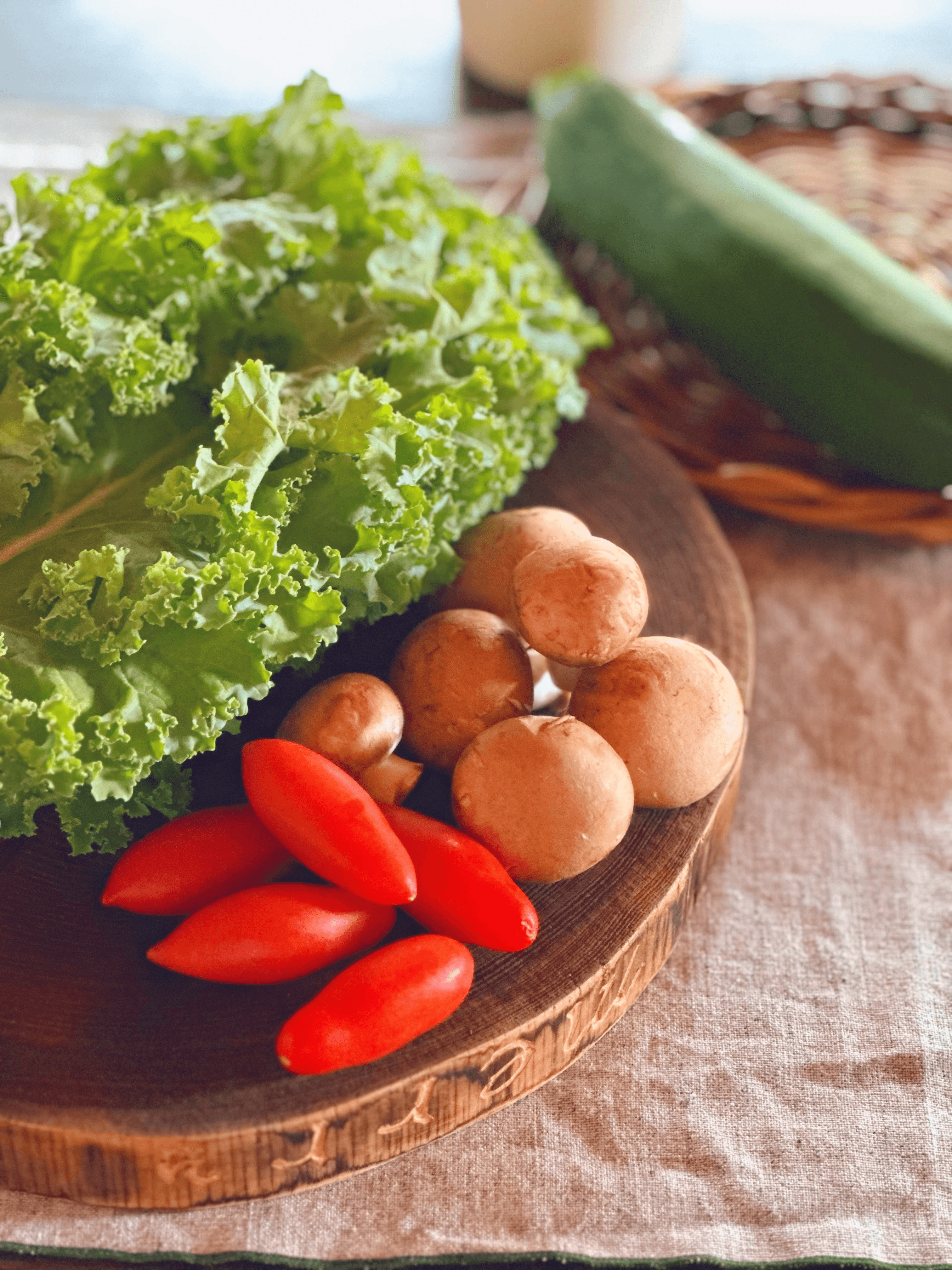 メインの食材:マッシュルーム・ズッキーニ・ケール・トマト