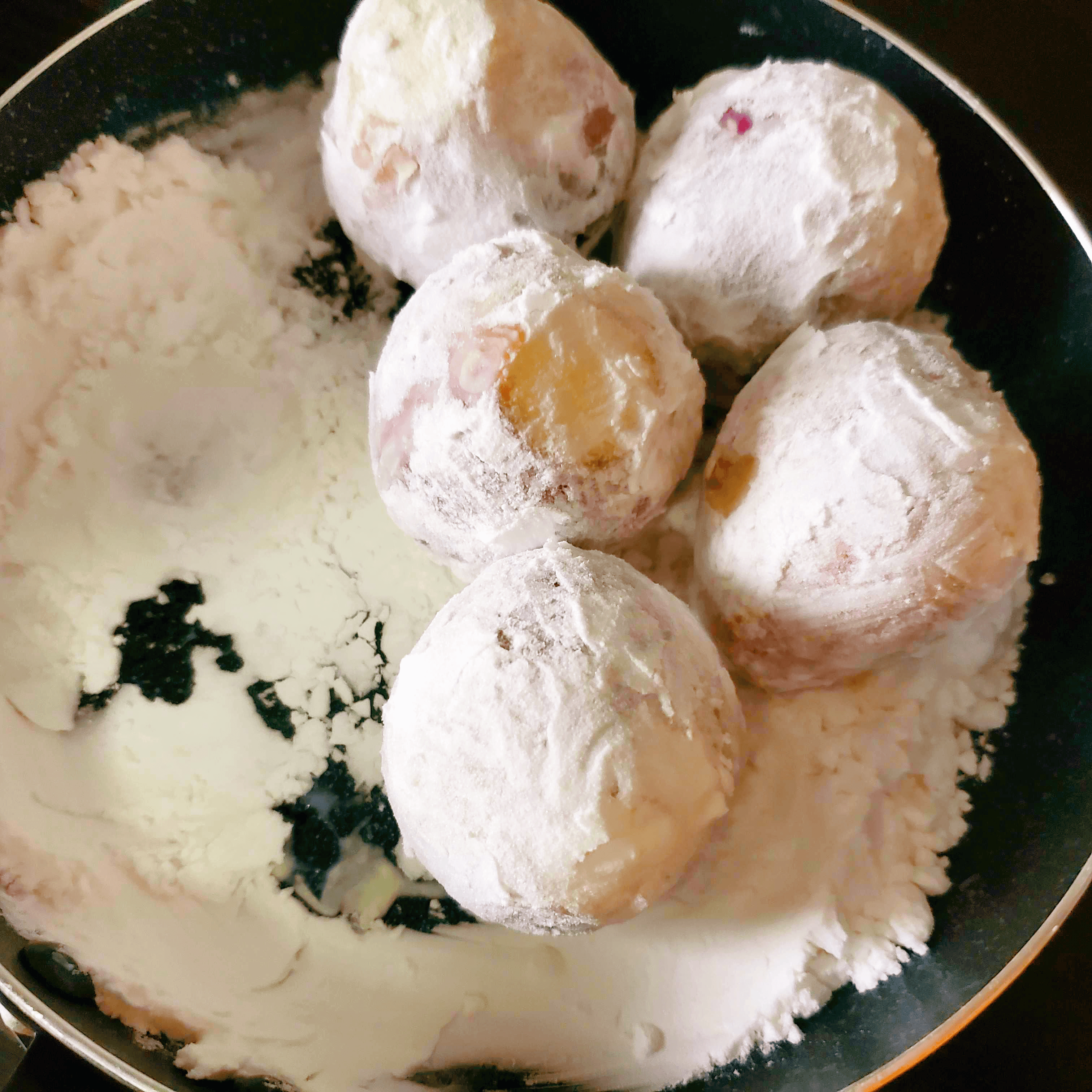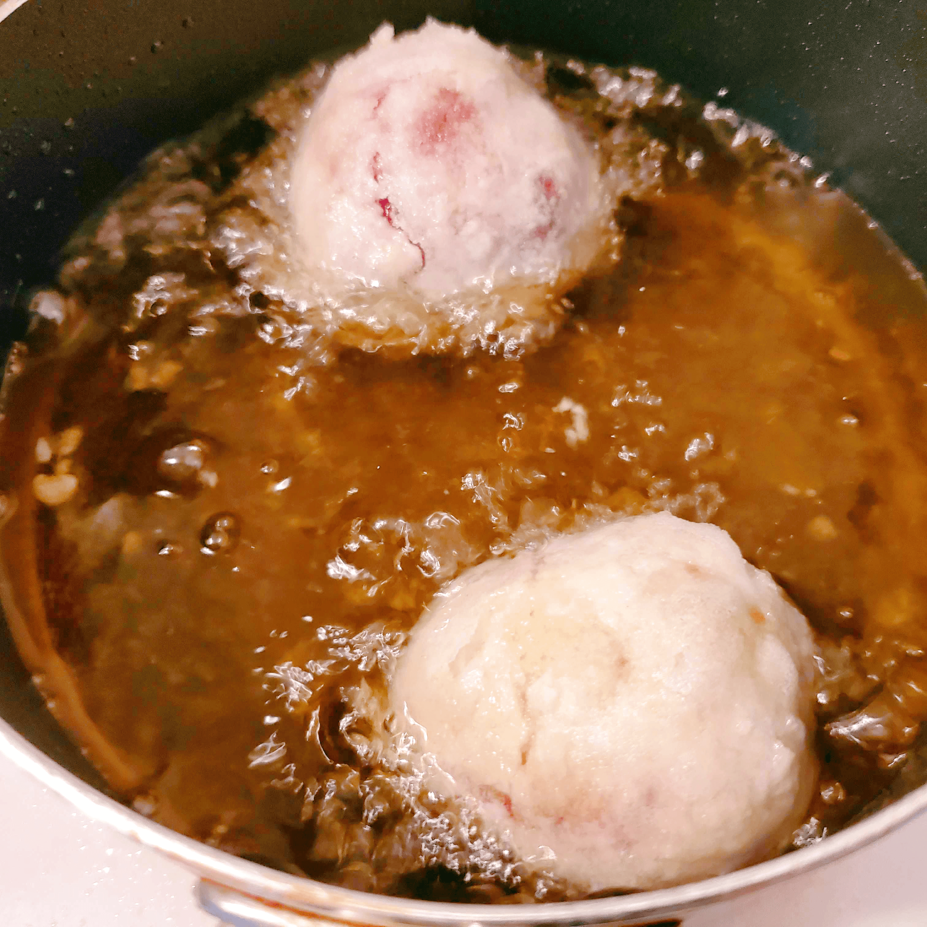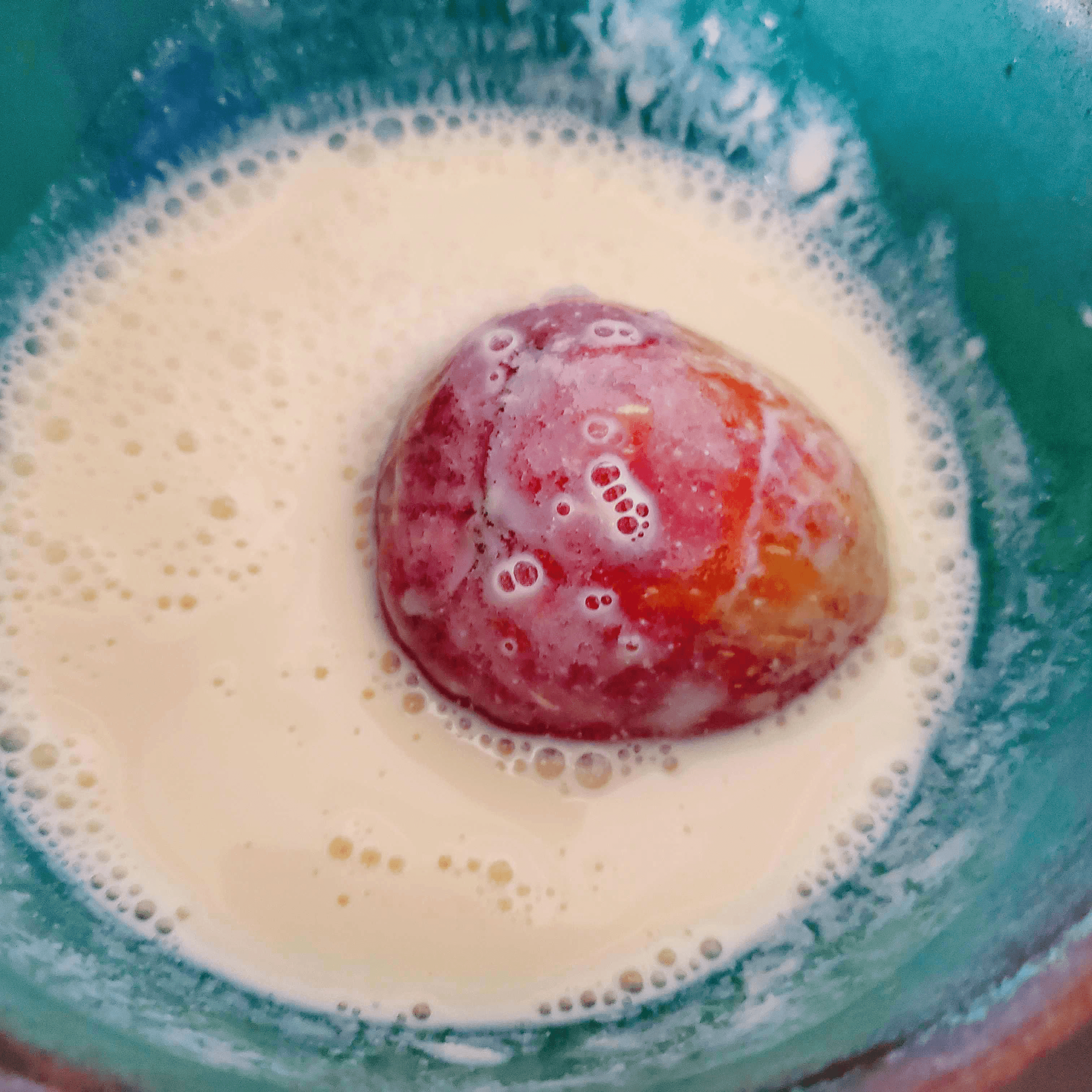 ・豆乳にお酢を加えるととろみがついて片栗粉がきれいにつきます。いちじくが浸るくらいの豆乳を出したらとろみのつき具合を見ながら少量ずつお酢を加えてください。リンゴ酢を使いましたが、他のお酢でも大丈夫です。
