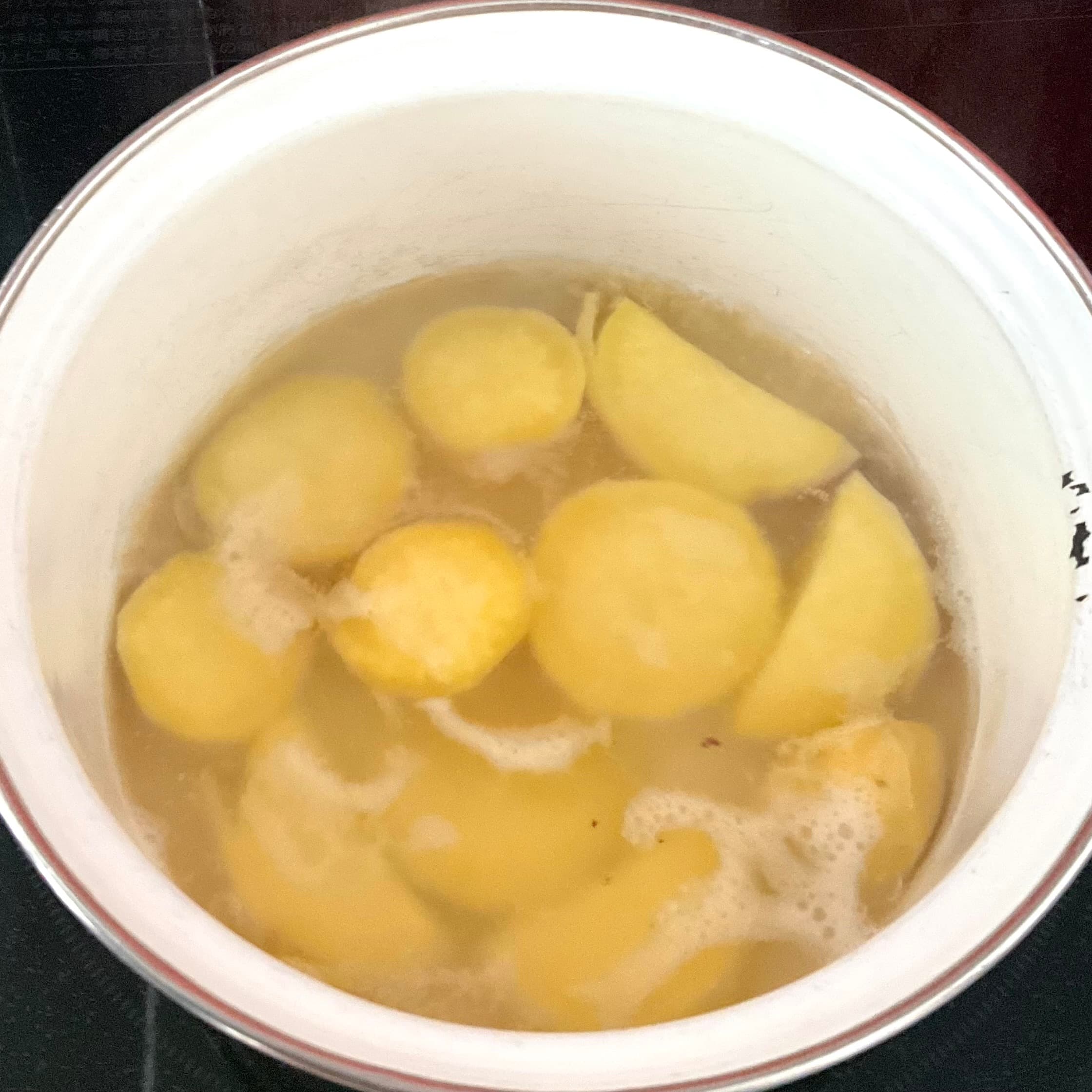 さつまいもを1cmくらいの厚さに切り、鍋に水と塩少々(分量外)と入れ、やわらかくなるまで茹でる。