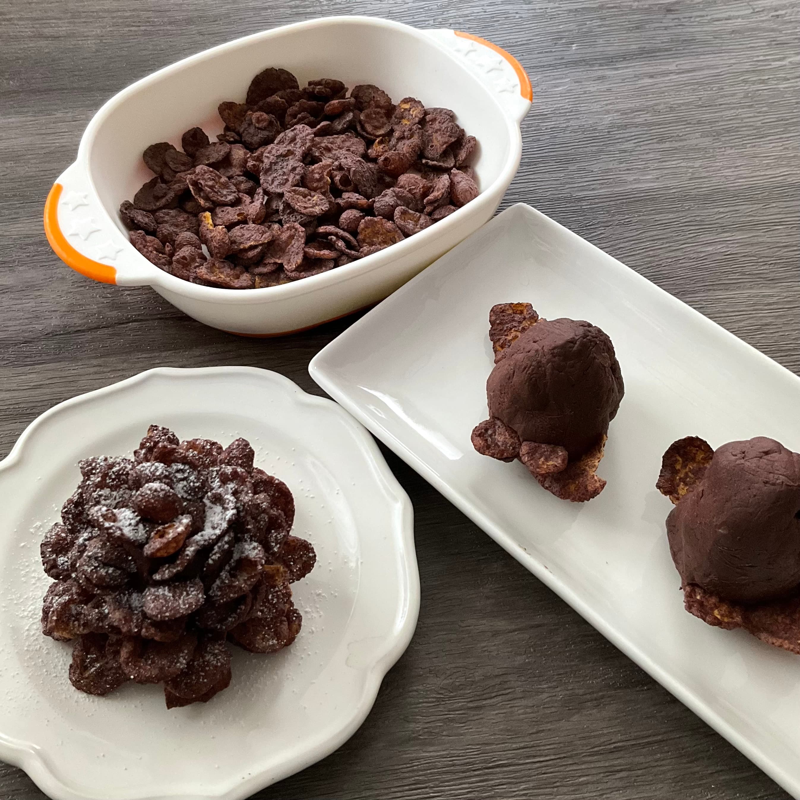 コーンフレークを隙間なく刺しこ仕上げに混ぜ合わせておいた粉糖を振りかけてできあがり。