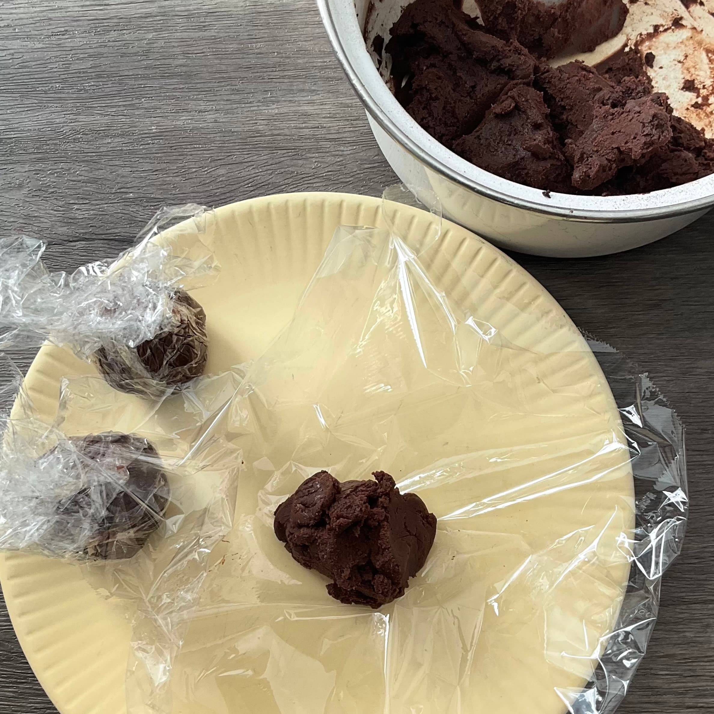 固まった生地を6等分し、ラップに包んで軽く握り、松ぼっくり型に整える。(溶けやすいので、触りすぎ注意)