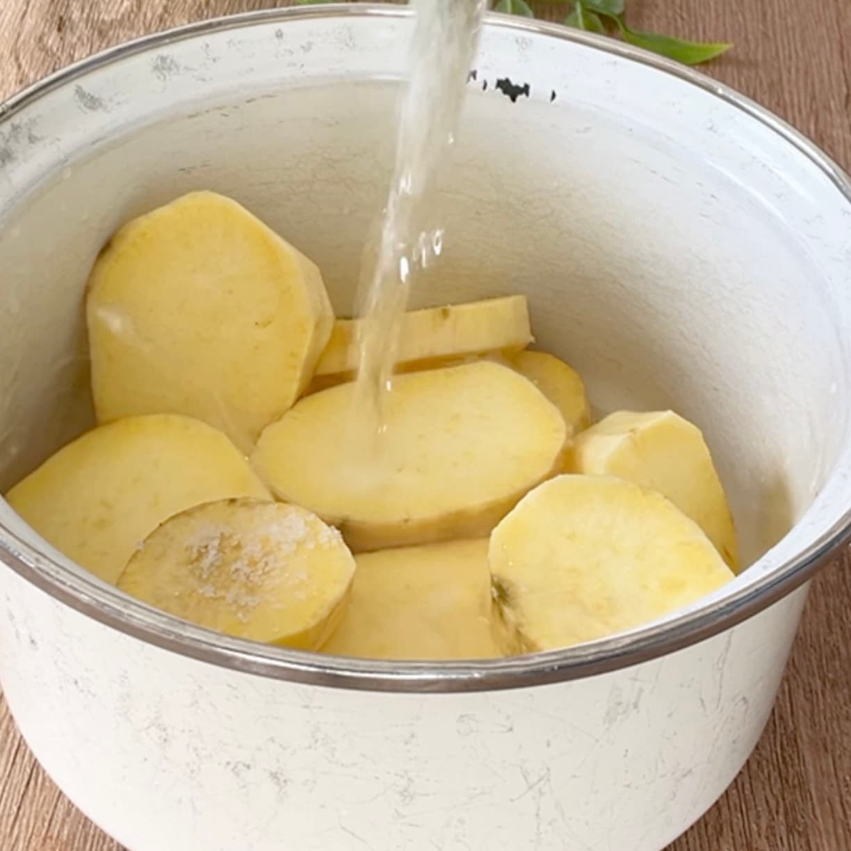 皮をむいて2cm厚さにカット。鍋に水と塩ひとつまみを加え、やわらかくなるまで茹でます。(塩を加えることでアクが抜け、鮮やかな黄色に仕上がります。)