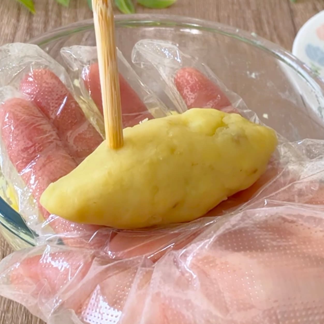 8等分し、さつまいもの形に成形。箸の先でくぼみをつけるとリアル感アップ。