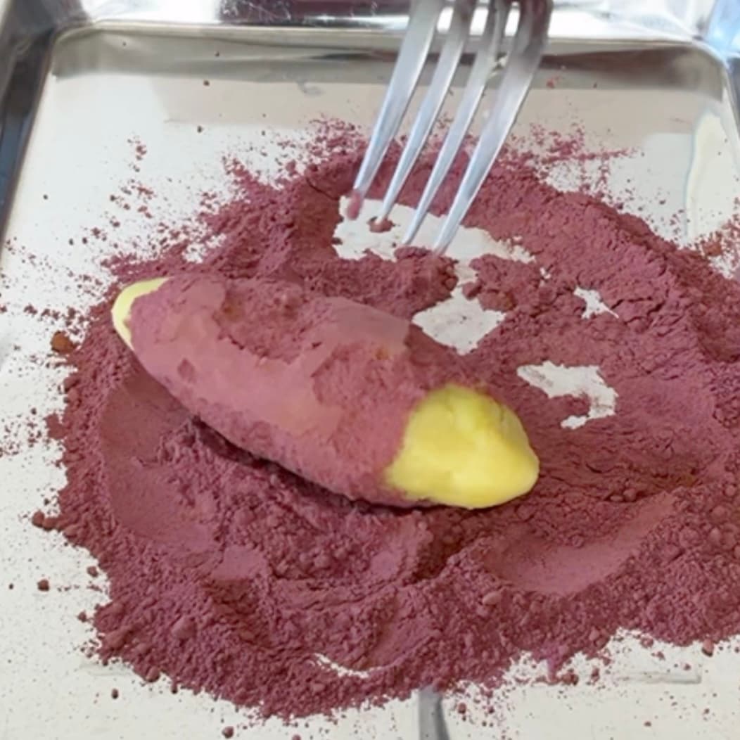 紫芋パウダーとココアパウダーを混ぜ合わせ、スイートポテト全体にまぶせば完成。