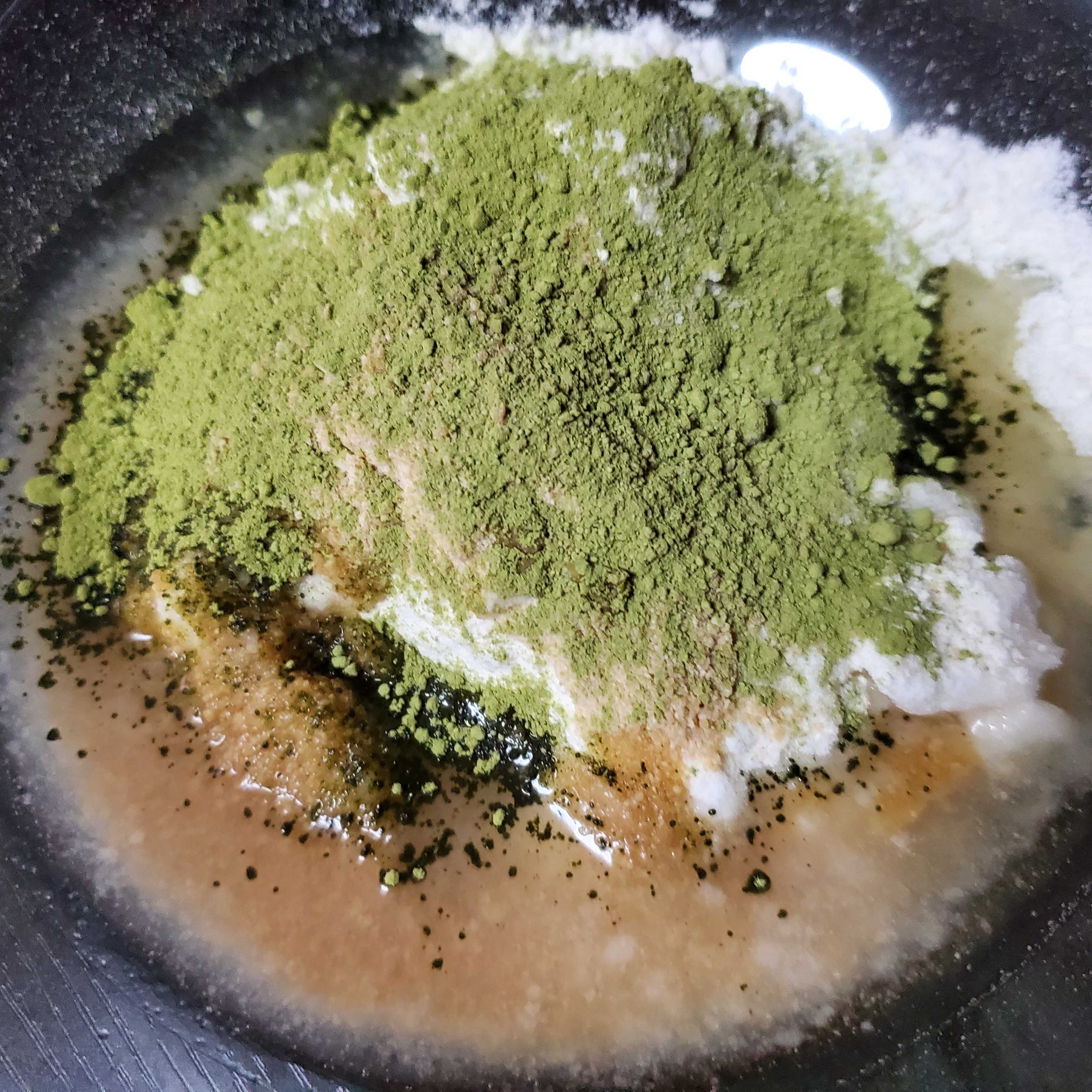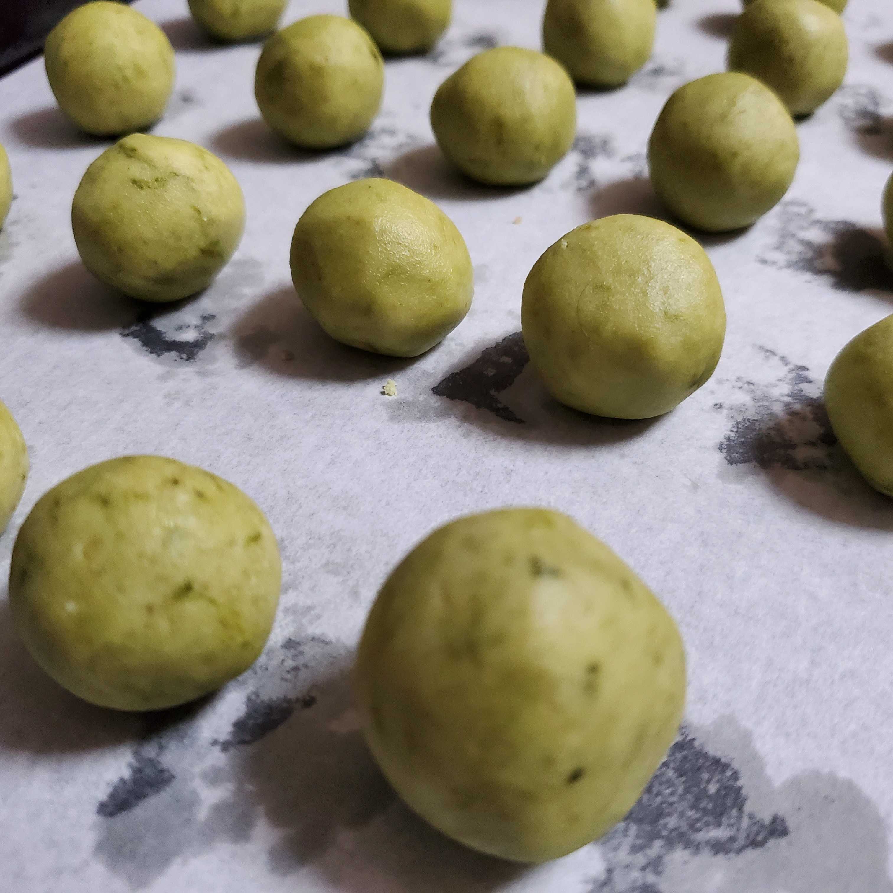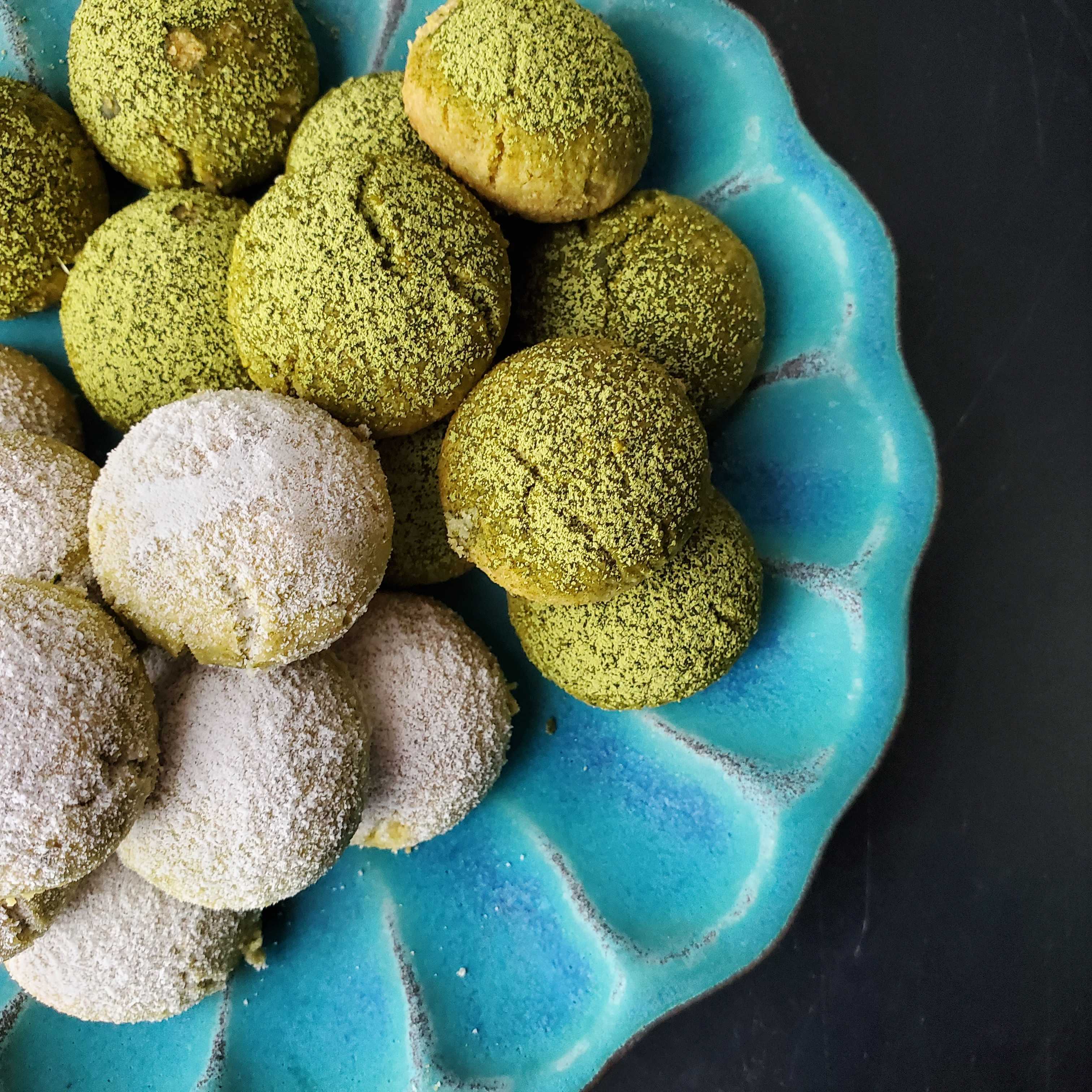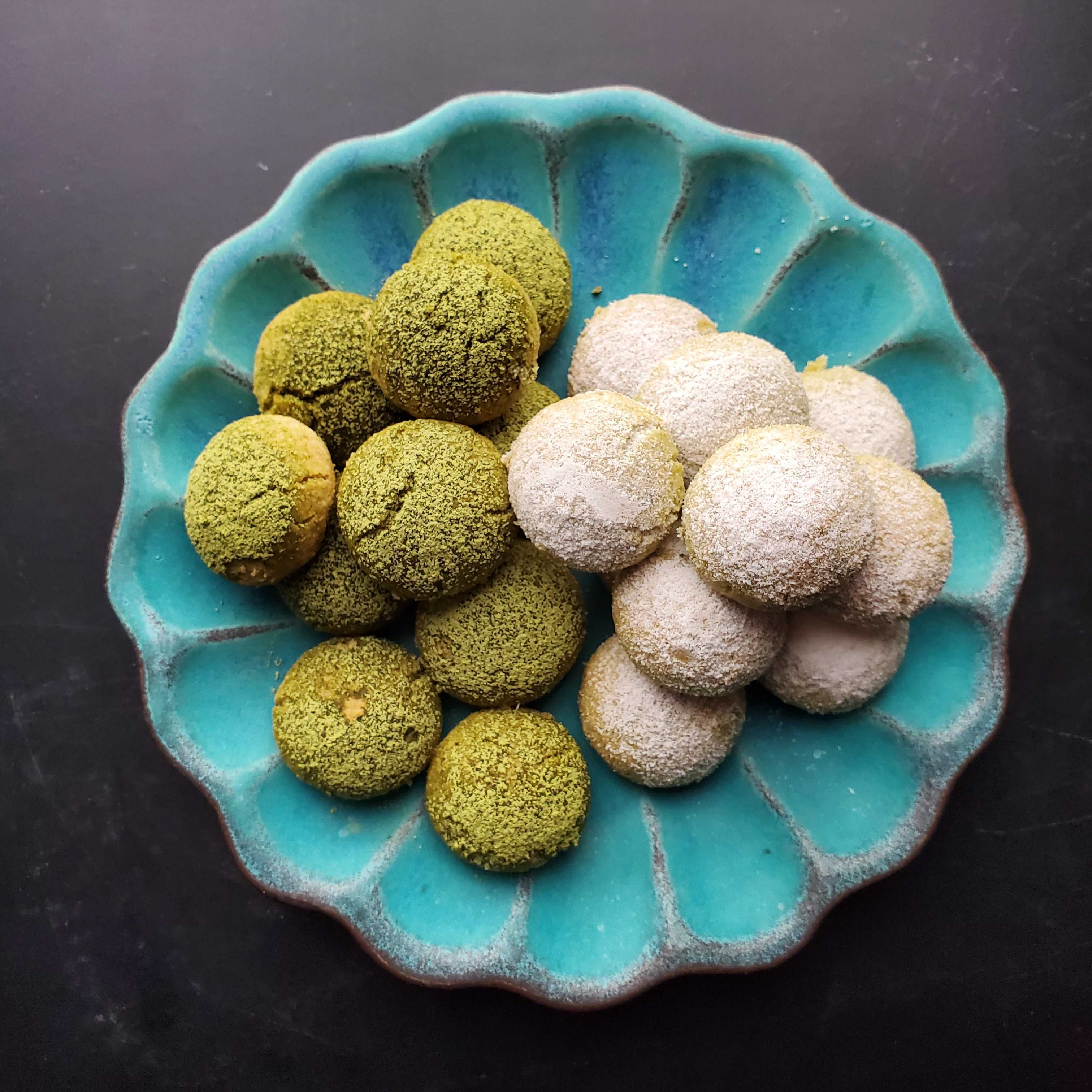 お好みで抹茶パウダーやココナッツミルクミルクパウダーをクッキーにまぶします。。