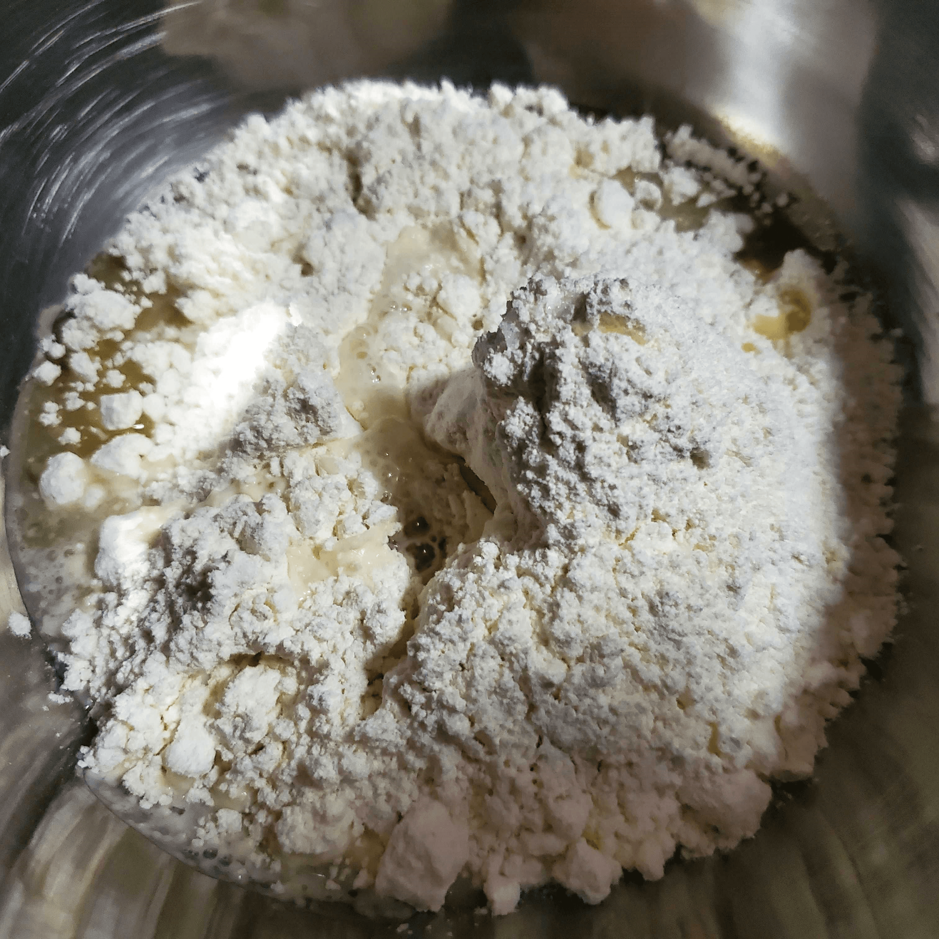 ピザ生地材料をすべて混ぜ合わせ、まとまってきたら手で捏ねます。