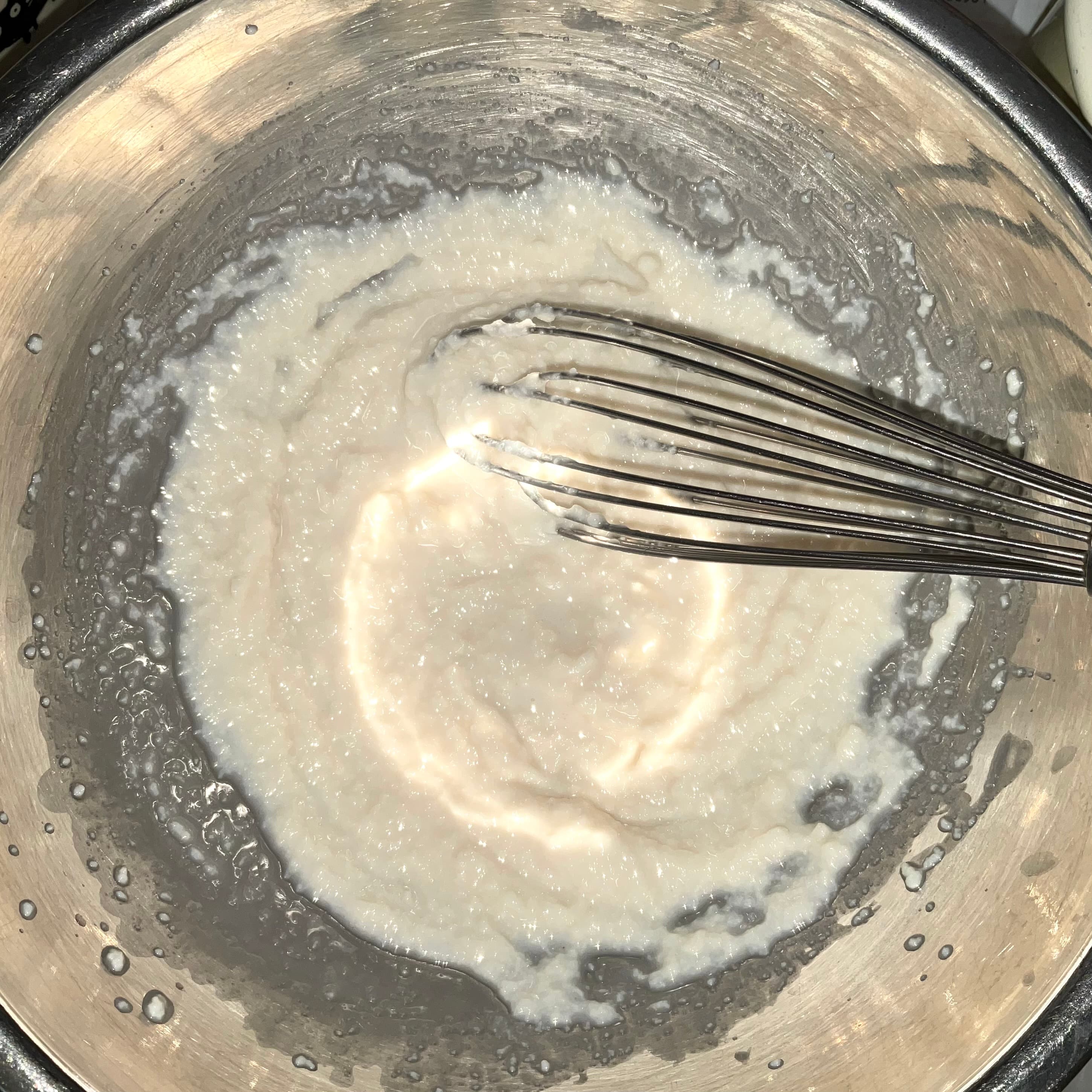豆腐をボウルに入れ、泡立て器で粒がなくなるまで潰し、植物油を加えてクリーム状になるまでよく混ぜる。