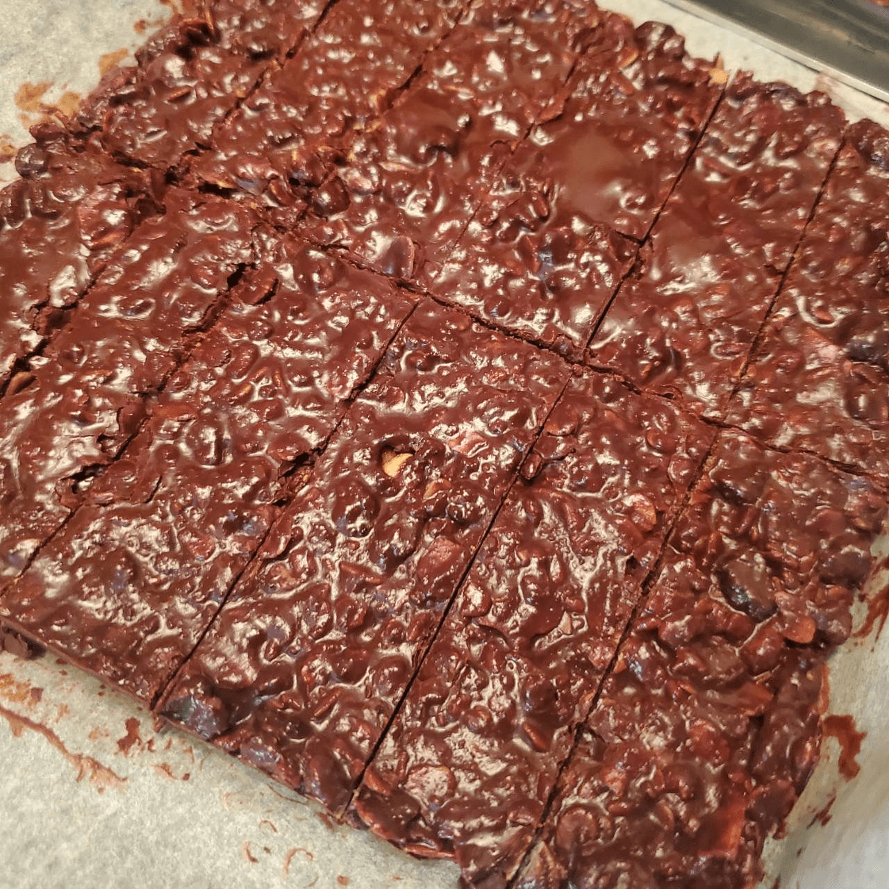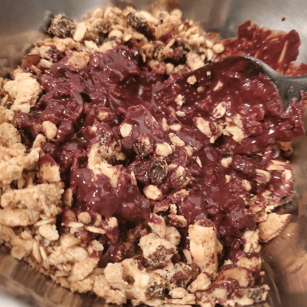 焼き上がったグラノーラにチョコソースを加えて混ぜ合わせ、スクエア型に流し入れて冷蔵庫でしっかり冷やします。