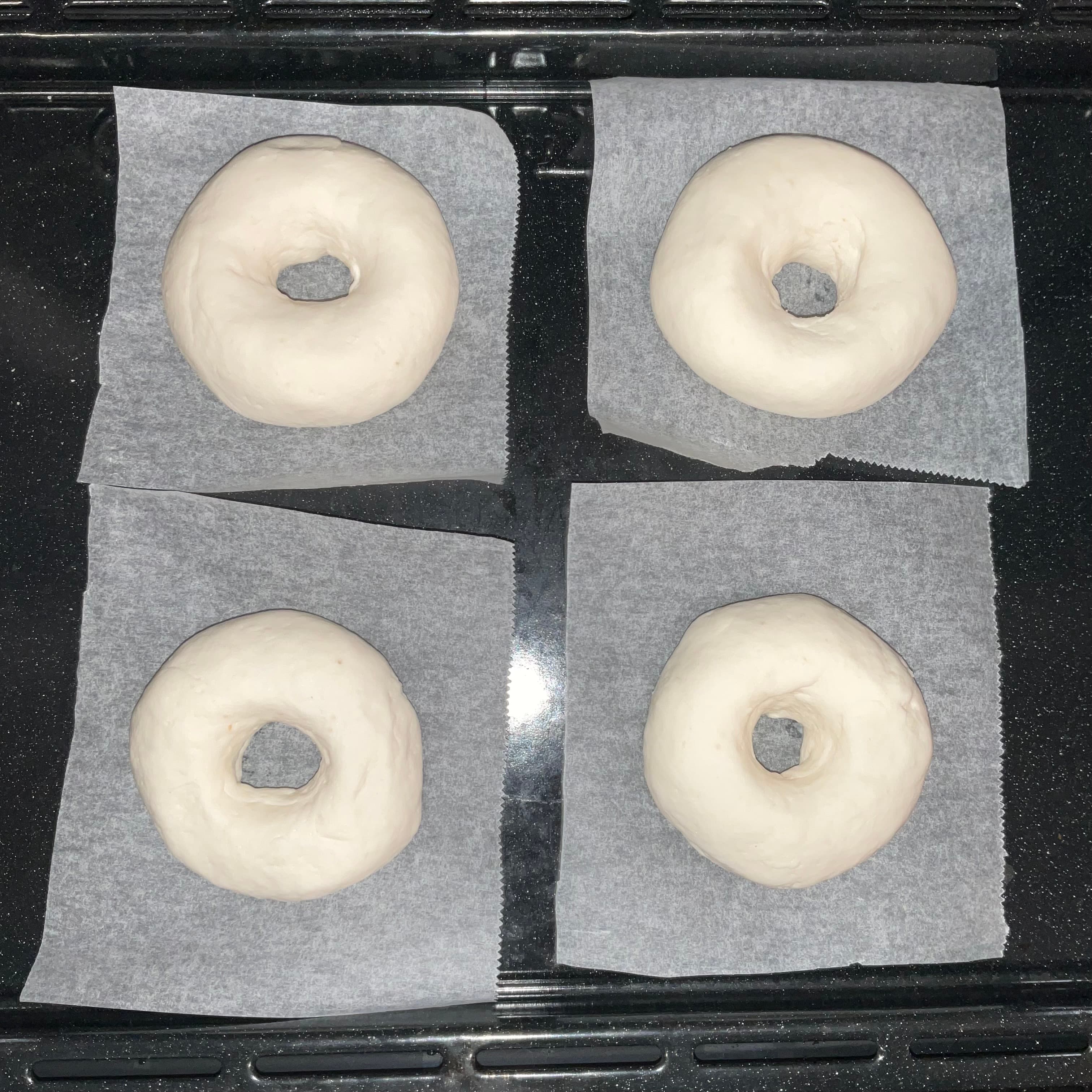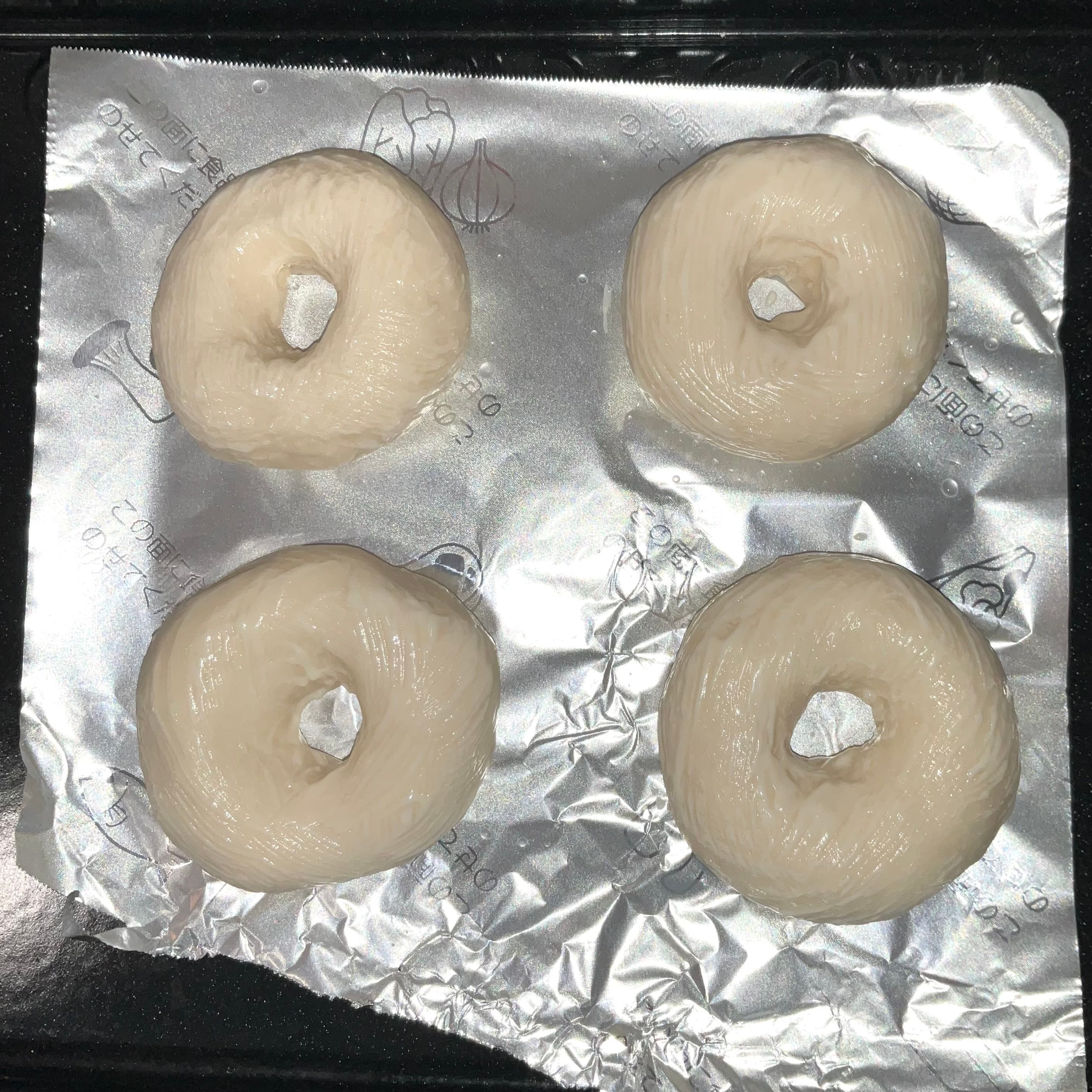4等分に丸めて真ん中に穴を開けてリング状にし、1個ずつクッキングシートにのせる。
