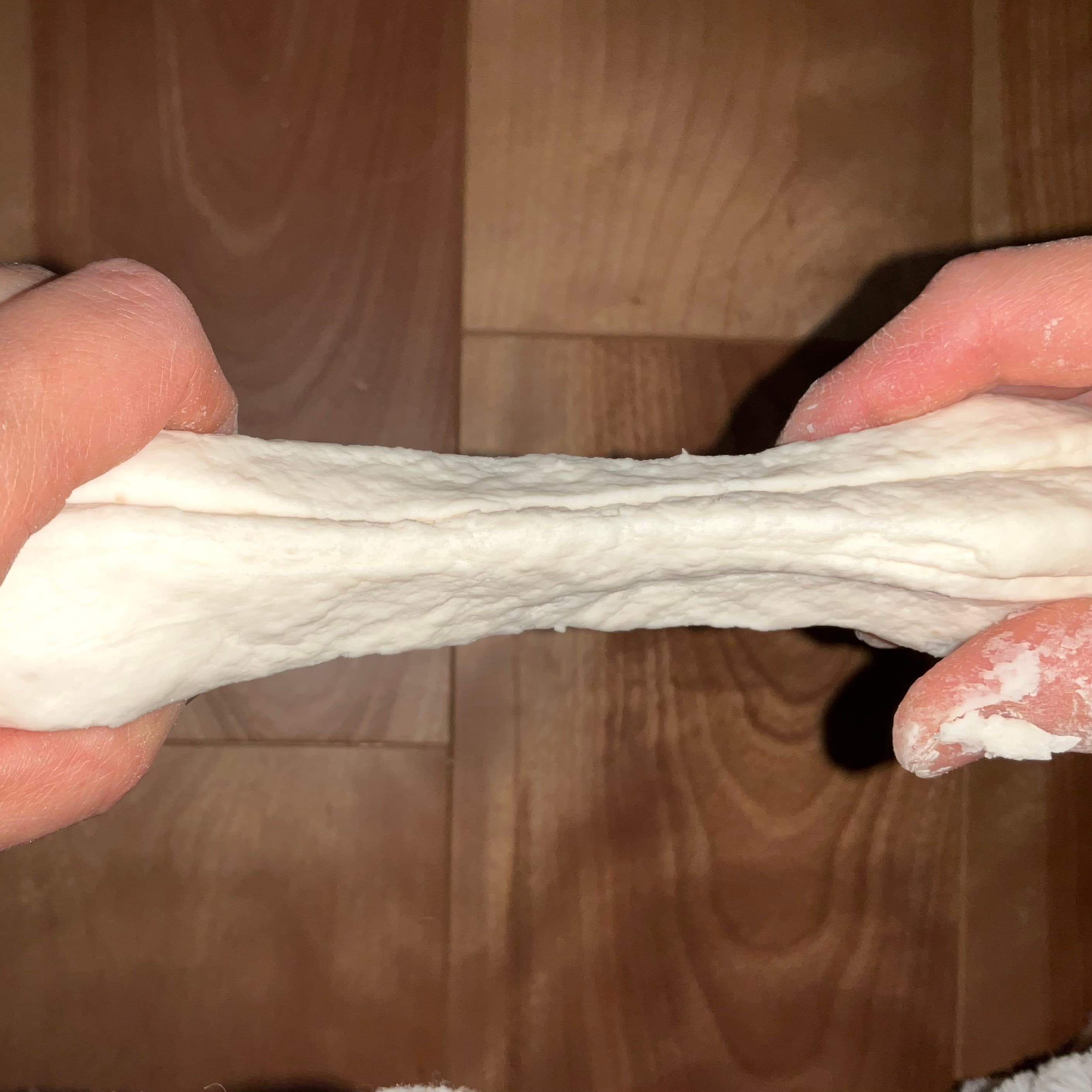 手で引っ張ると千切れずに20cmくらいよくのびるようになったら、生地の完成。