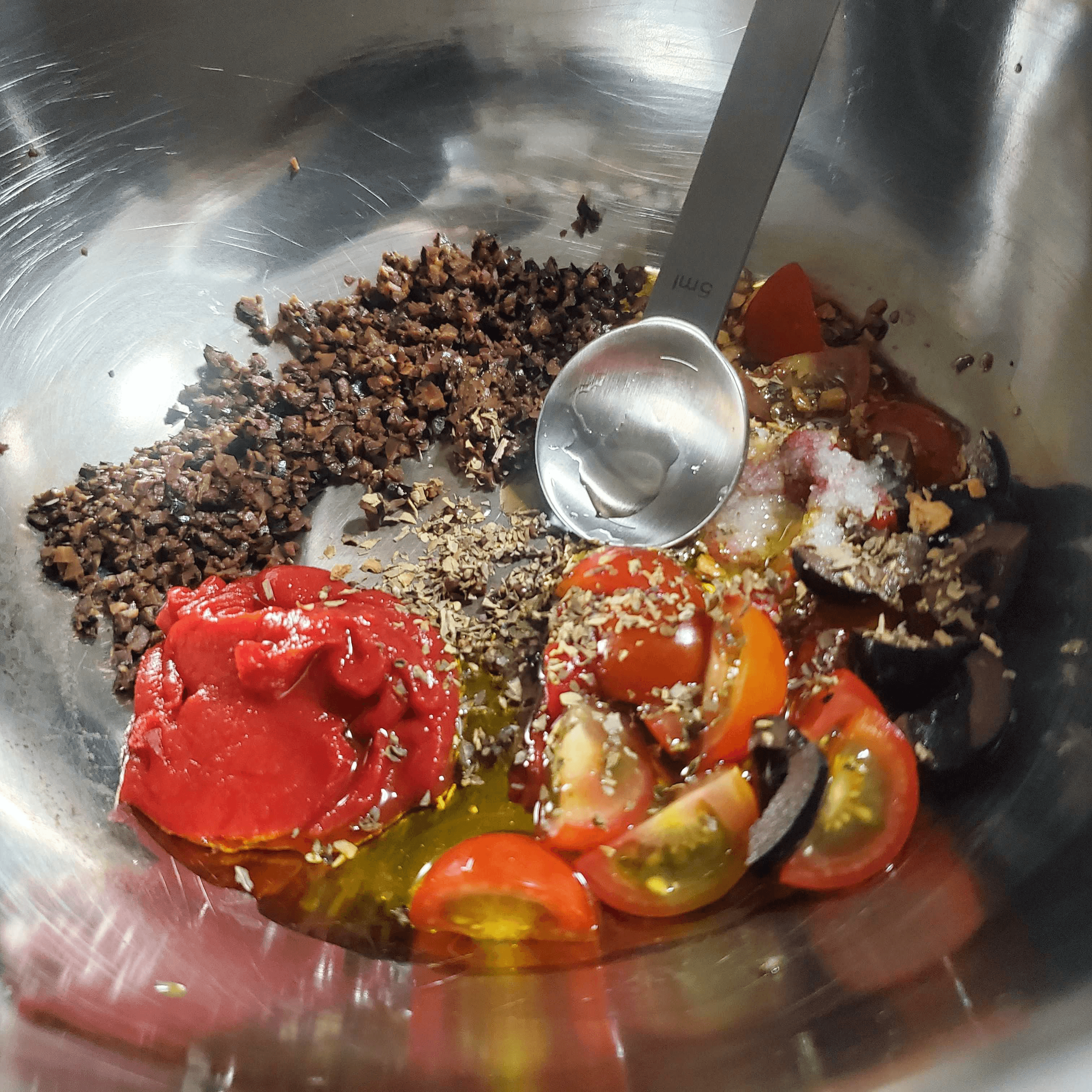 ・フライドガーリックとトマトペーストを使うことで火を使わなくてもしっかりと味の乗ったソースを作ることができるレシピです。本来プッタネスカに入れるケッパーは今回省略しました。より本格的に作りたい方、ケッパーが手軽に手に入る方は入れてください。