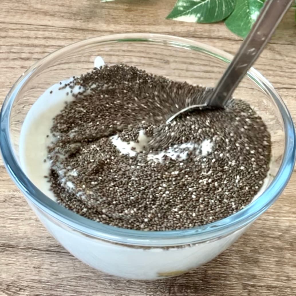 常温で10分ほど置き、チアシードが水分を吸ったらもう一度かき混ぜる。