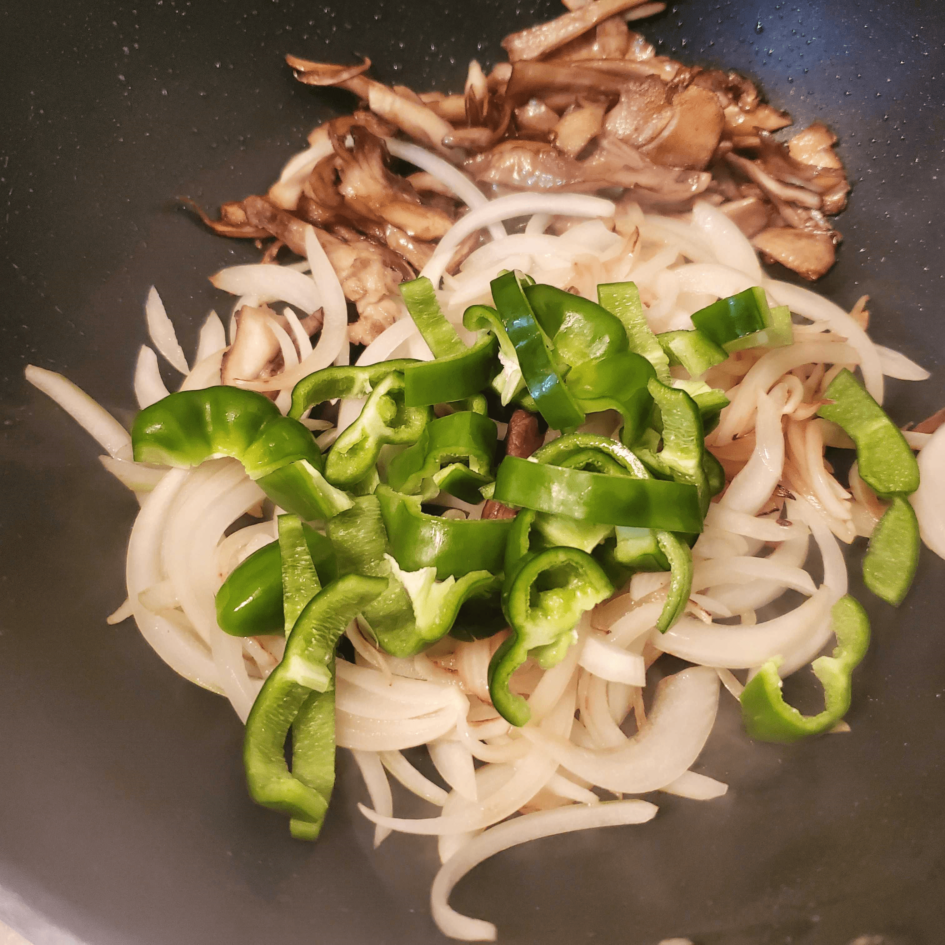 油を敷いたフライパンで舞茸に塩をしてしっかり炒め、玉ねぎ、ピーマンの順に火を通していきます。ピーマンを入れたら軽く炒めるだけで大丈夫です。