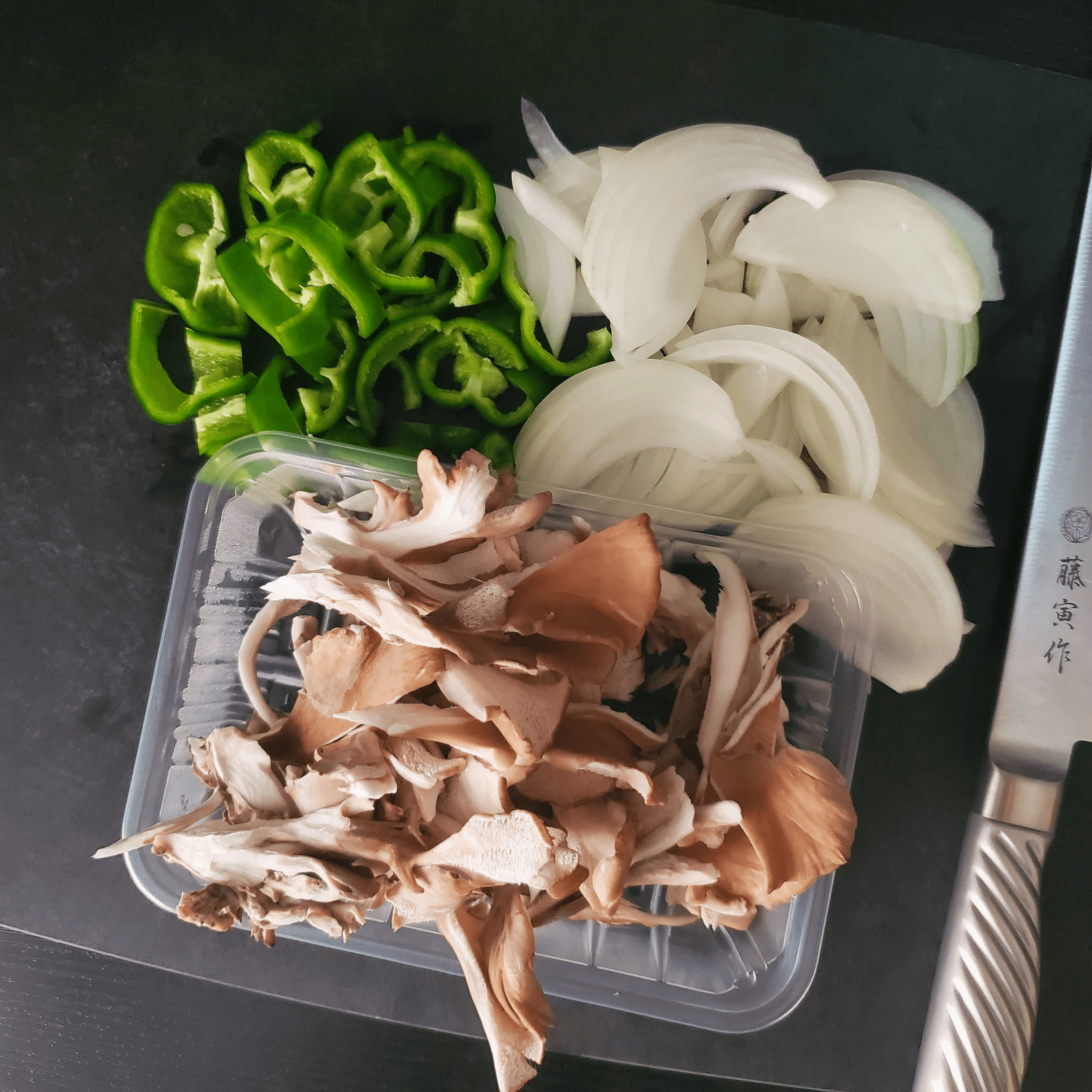 玉ねぎ、ピーマンは厚めにスライス、舞茸は手で割いておきます。