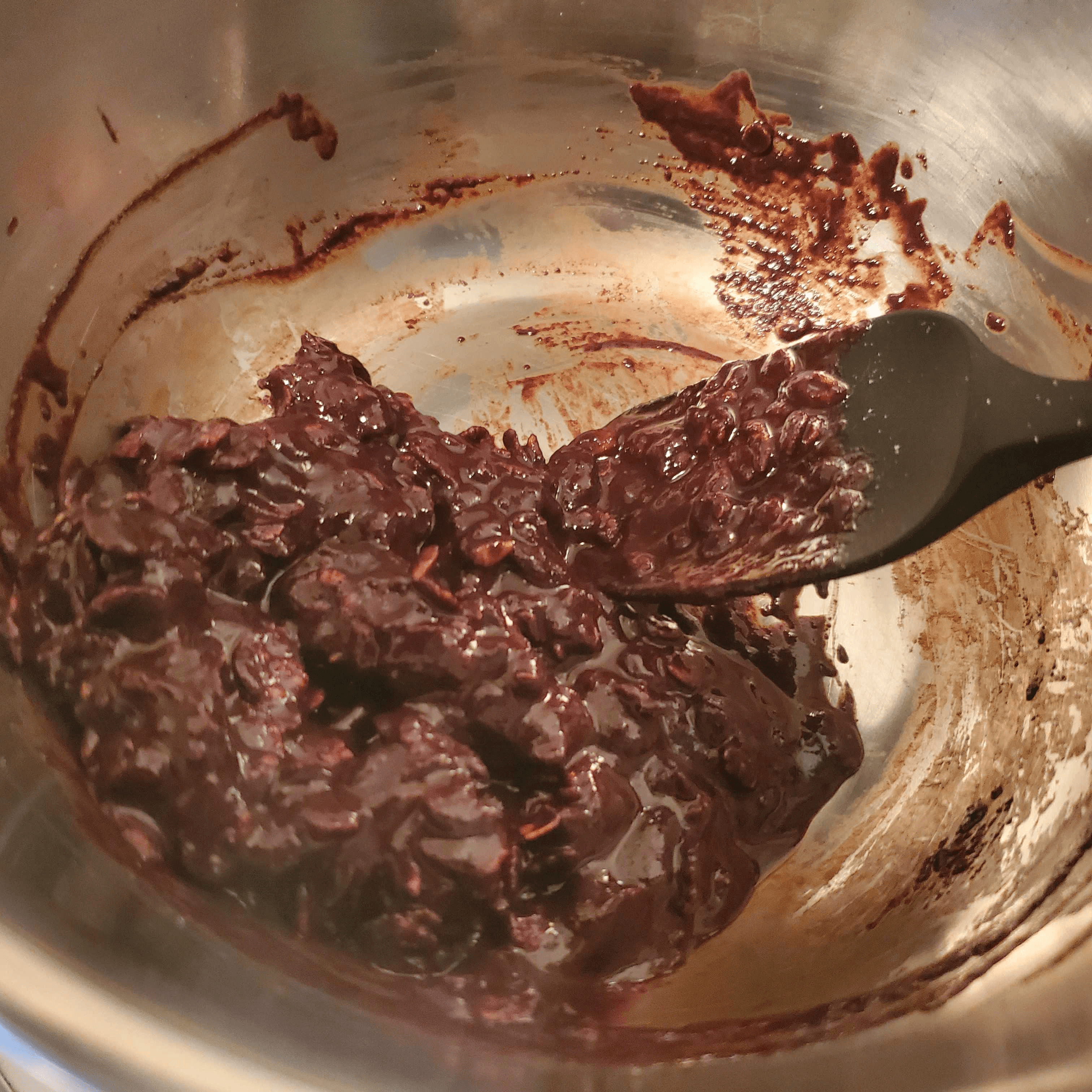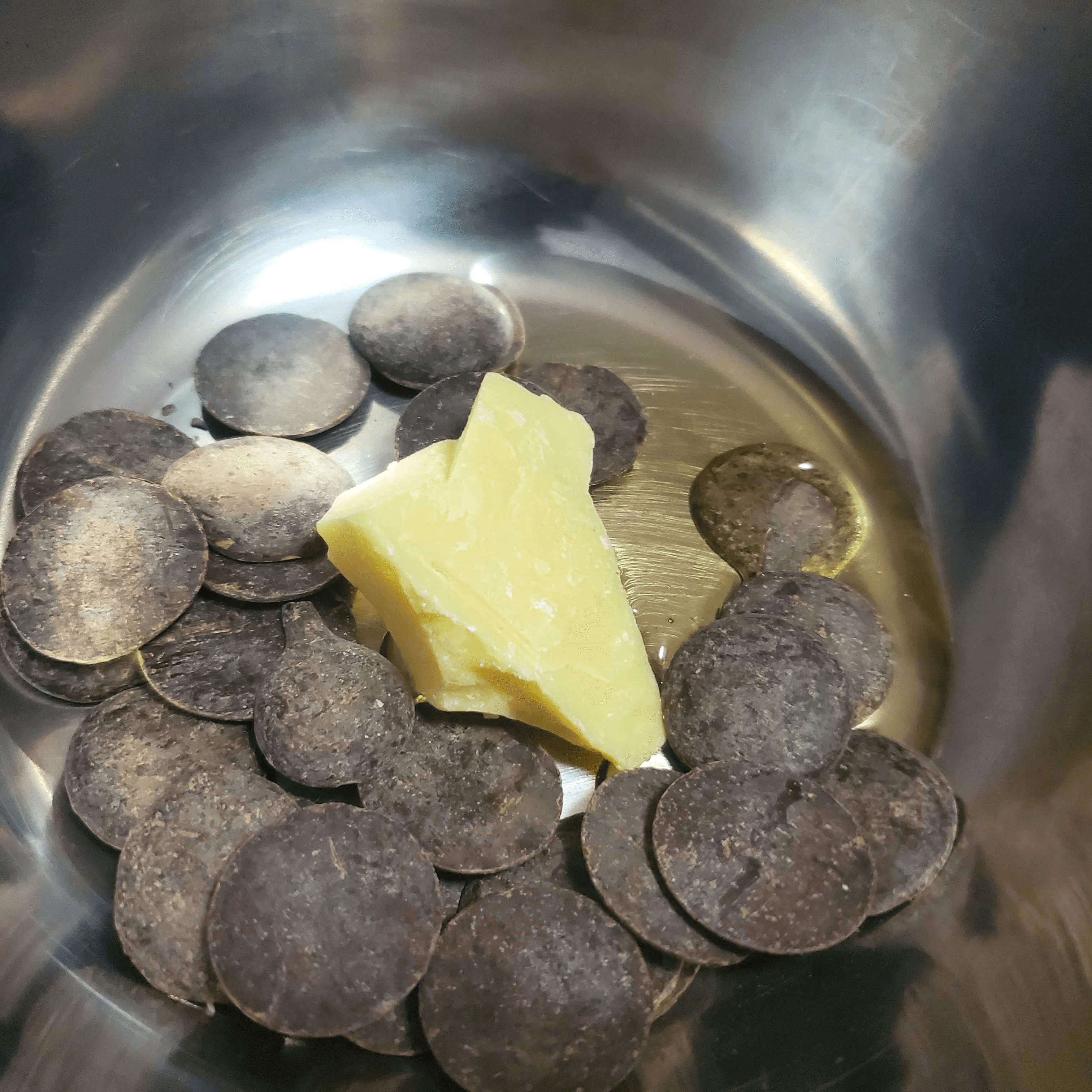 カカオマス、カカオバター、アガベシロップをボウルに入れて湯煎で溶かします。
