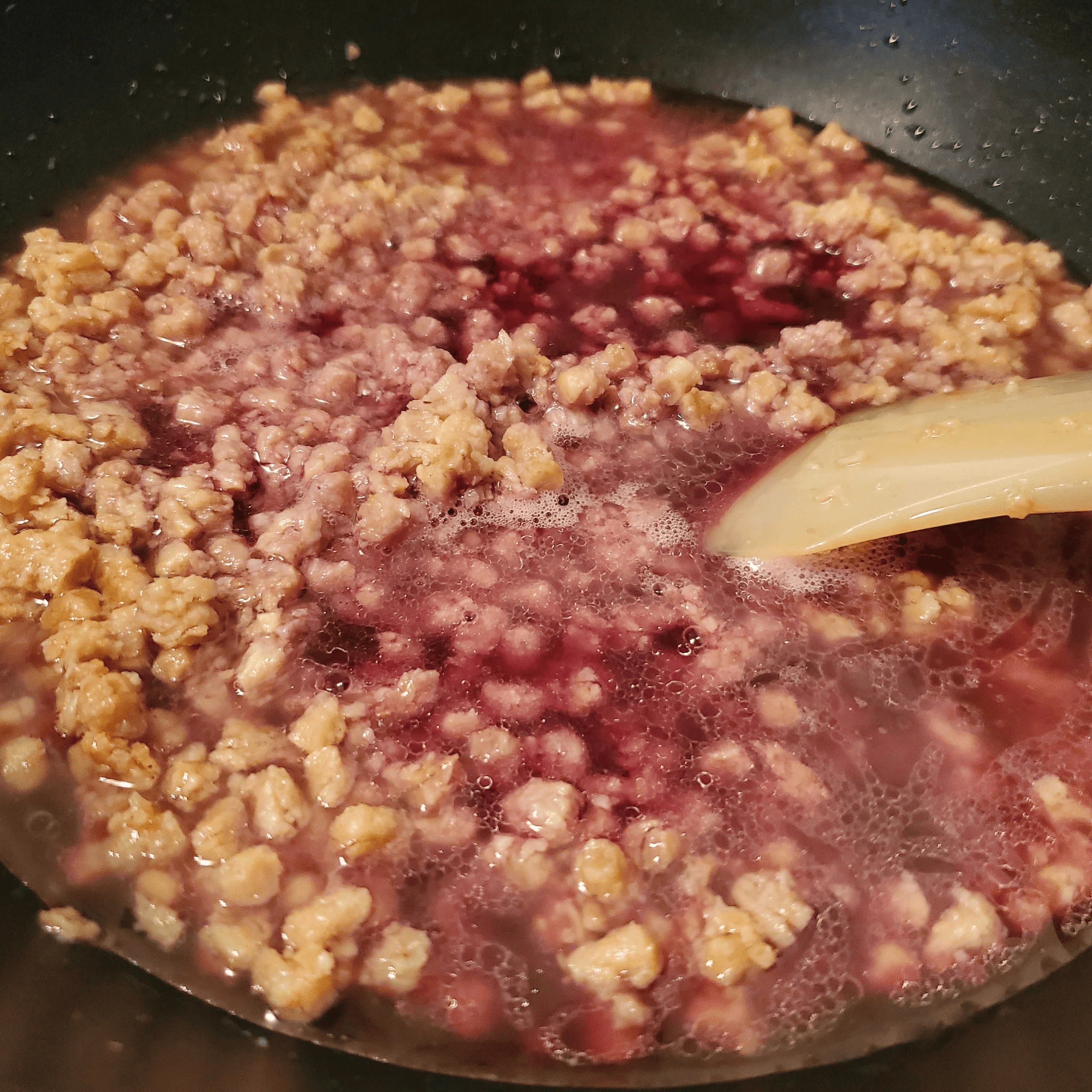 赤ワインを加えて水分が飛ぶまで煮詰めます。