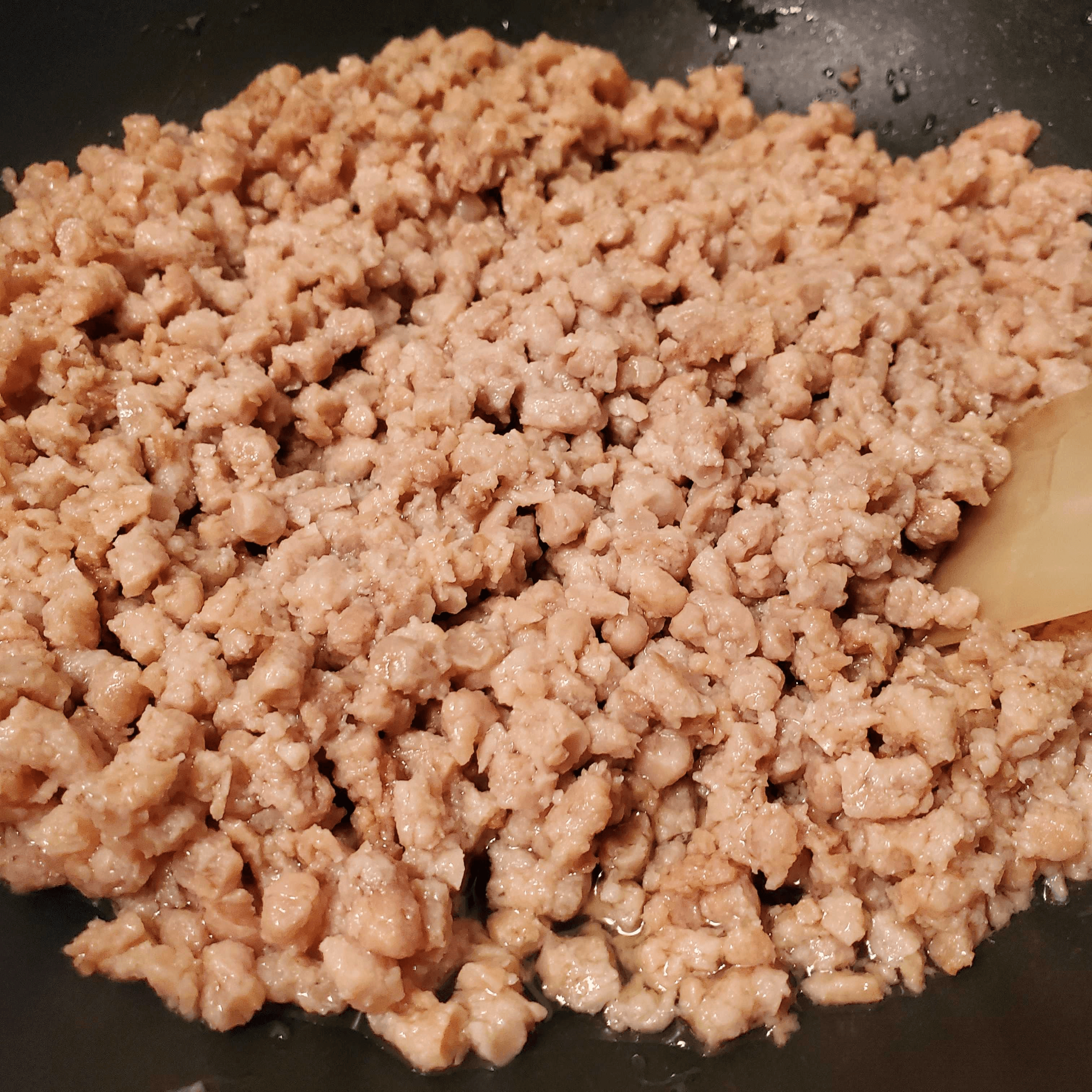 オリーブオイルを加えて熱したフライパンに大豆ミートを入れて炒めます。